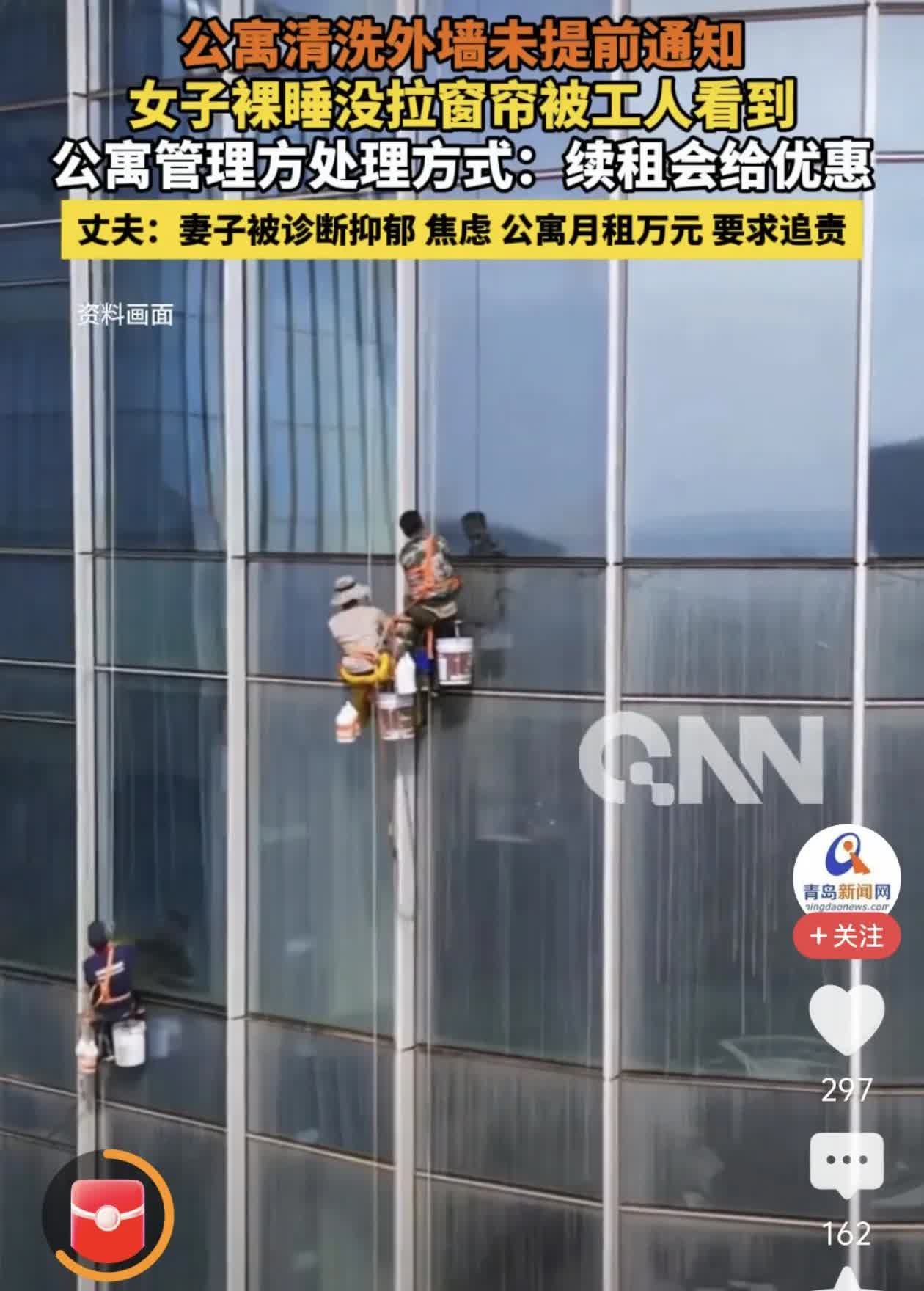 女子在高层家中裸睡没拉窗帘,物业安排工人清洗玻璃未提前通知,结果,被看个精光,这