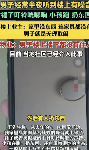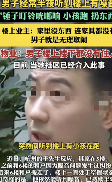 杭州一男子称,自己所住的地方,近半年来,经常在晚上听到楼上有小孩跑、扔东西等奇怪的声音,但更让其疑惑的是,他家楼上楼下这半年根本就没人居住,这噪音又从何而来?