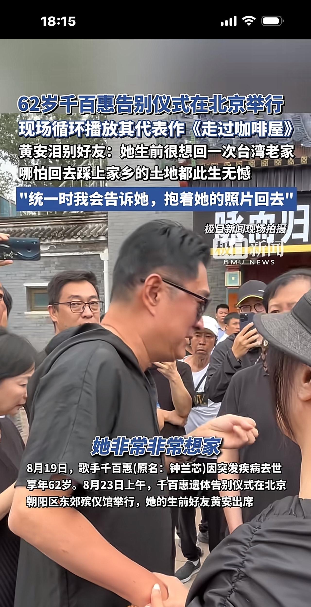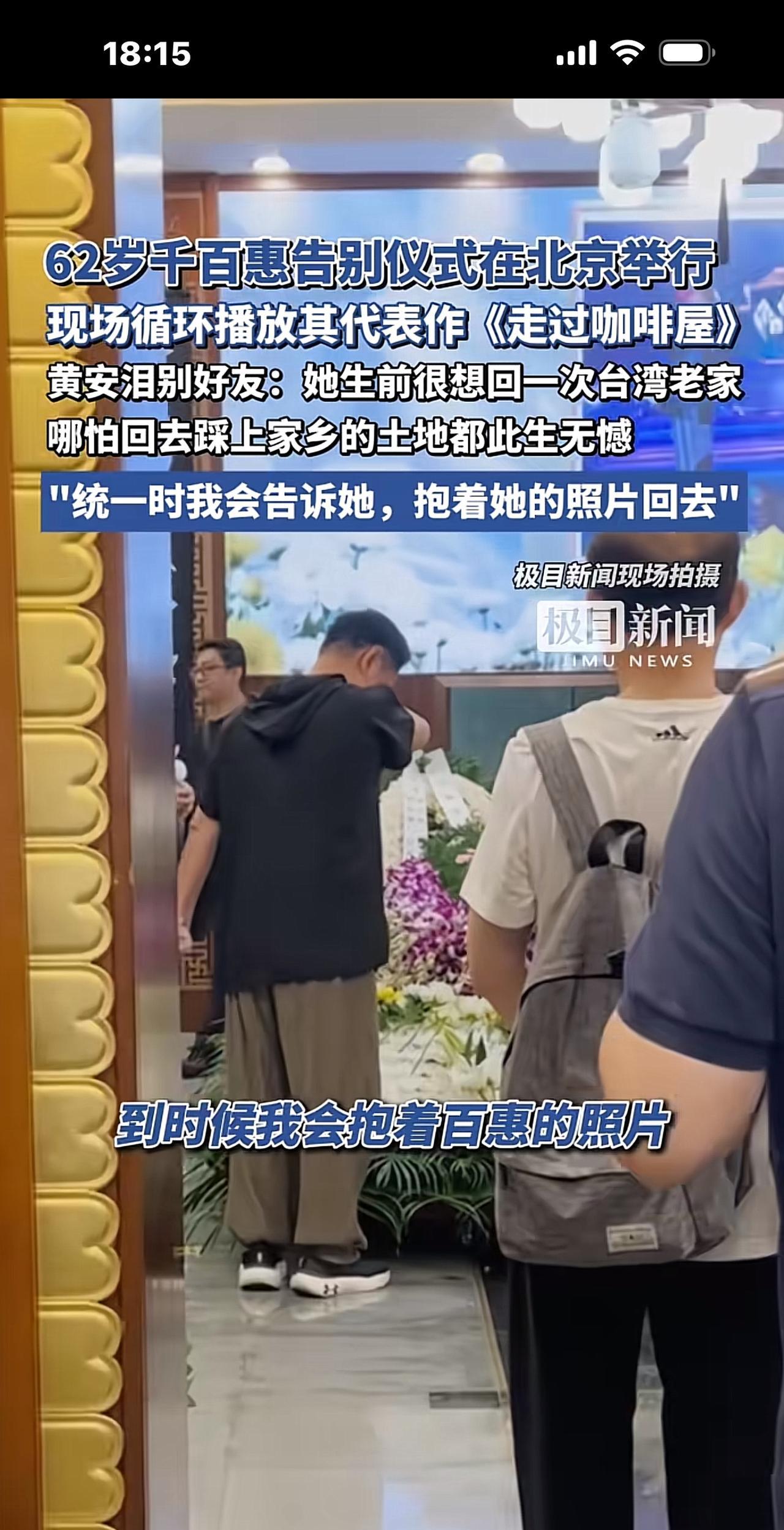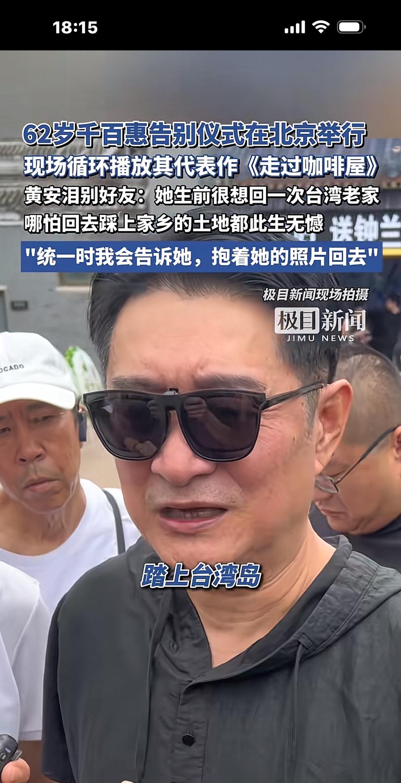 黄安说:“千百惠单纯为了爱到这边,她为爱而活,她很早辍学了,高中都没有读完,家里条件不好,教育环境就那样。” 今天,在北京,千百惠的告别仪式上,黄安穿着一身黑衣,回忆已故老友,对大家说。 两人相交几十年,也是老朋友了,他们都是台湾新竹人,老家乡相距仅14公里,又同来大陆发展,有同是故乡人的亲近。 当初千百惠在一家餐厅工作,也是她慧眼识珠,听黄安唱了两首歌,特别赏识他,马上录用了他,把他介绍给了老板驻唱,由此,黄安让更多人认识,他的唱歌天赋没有被埋没,后来一举成名,大放异彩,演唱了许多脍炙人口的歌曲。 黄安对千百惠的恩情铭记在心。 他一直以为千百惠比他年纪大,没想到他们同年出生,如今都是62岁,更没想到,她比他先走一步。黄安说“比我先走一步”时说得很轻,似乎对生死问题已然看淡,还可能黄安信佛,所以对生死带入了宗教的思考。 黄安对好友的猝然离世心痛不已说: 最遗憾的是,千百惠因为拿了大陆身份证回不了台湾,我经常回去,就跟她视频说,我们是同乡人,我们在一家餐厅认识,然后我就指着那家我们初识的餐厅(给她看),她只能在视频里看见、回忆,不能亲自踏上那片土地,每次,她就大哭一场……因为拿了大陆身份证就不对,就是忘恩之源嘛,对台当局就是这样。 顿了顿,黄安哭得泣不成声地说:她非常非常想家,哪怕回去踩上土地,她都觉得此生无憾。 就在去年农历新年的时候,黄安回了台湾老家,传了一个放鞭炮的视频,千百惠羡慕不已,说“呜呜呜,我啥时能落叶归根啊”,有些凄然,不过最后千百惠收起伤心,以一句玩笑话带过了,叫老朋友替他多吃一点家乡的味道。 最后,黄安很有信心,几乎毋庸置疑地说:统一的时候我会告诉她,我到时会抱着百惠的照片踏上台湾岛! [微风][微风]