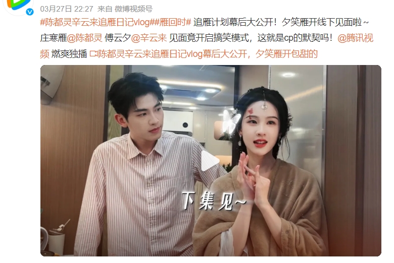 当初剧播的时候,因为男女主剧宣的物料很少,所以辛云来被网友呼吁去陈都灵剧组拍物料,被网友称之为“追雁计划”,辛云来整个过程都全程直播,热度还挺高的,从那之后,《临江仙》,《书卷一梦》,《献鱼》等好几部剧,剧播期间男女主都去对方剧组探班,不过后面这几组都太刻意了,没有辛云来当时的行为真是可笑。