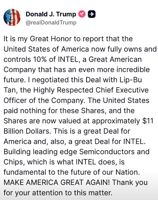 陈立武不同意交割英特尔10%股份的时候大骂陈立武,说要对其进行安全审查;陈立武同意交割10%股份以后大赞陈立武,说他备受尊敬。 这风格很特朗普,说到底也很美国。 下一个是谁呢?估计美国很多科技公司CEO都在胆战心惊,不知道哪一天这件事落在自己身上。 这样也好,以后美国的优质企业都是美国联邦政府的,然后被其他国家拒绝进驻,然后美国企业就关起门自己玩。