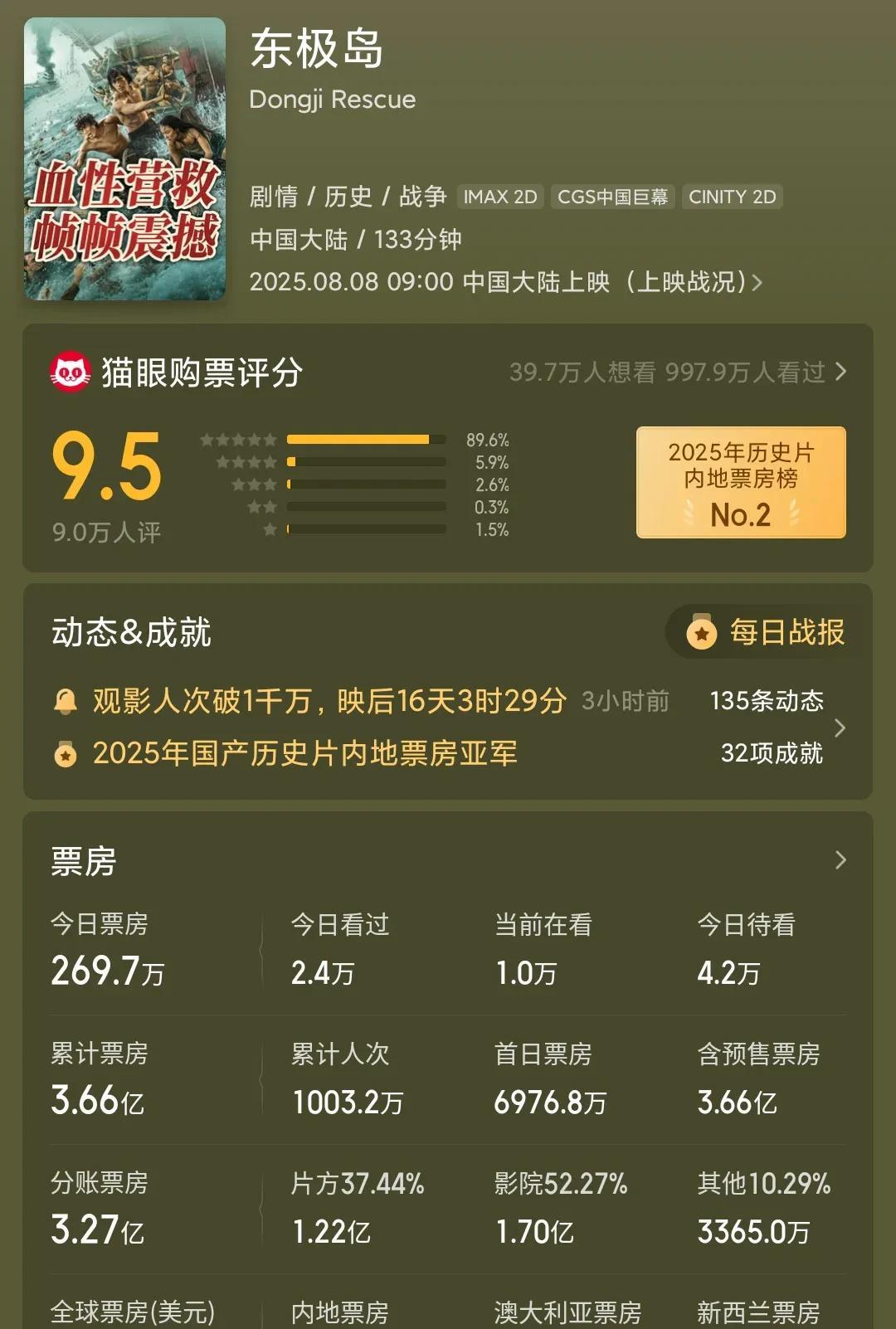 8月16日上映的《捕风追影》豆瓣口碑已经出来,8.1分,累计票房5.3亿,预测最终票房11亿。 8月8日上映的《东极岛》已经扑了,口碑还没有出来,这是在进行最后的票房保护。从刚上映时候预测8亿,一降再降,现在变成3.96亿,等密钥到期就会被撤下。