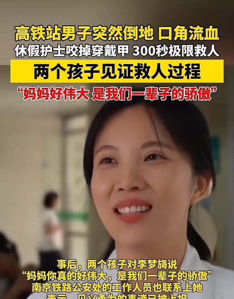 近日,南京南站突发一个紧急事件,一男士突然晕倒抽搐。随后广播迅速在候车大厅播报,希望找到医护人员救治。护士李梦旖听到广播,迅速安顿好自己的孩子,让他们原地待着不要跑,自己则快速向病人的地方跑去! 看到病人后,她迅速咬掉妨碍自己救人的穿戴甲,双腿跪地快速的确认病人的情况,整个过程相当麻利。当发现是癫痫发作,她熟练的清除病人口中异物避免窒息。最终,经过一番救治,病人慢慢好转,确认病人恢复意识可以说话后,李梦旖这才放心离开!而这时,距离发车已经不到三分钟,她来不及休息,又马不停蹄的去检票!好在工作人员给开了绿色通道,终于李女士一家在发车前几秒上了车! 事后,大家知道此事,纷纷称赞李梦旖护士是救死扶伤的「英雄」!而李护士则谦虚的说道,“我不是英雄,我只是换了个地方上班。” 多么朴实而有责任感的好护士啊,这才是我们心目中的「最美护士」吧!为李护士点赞!
