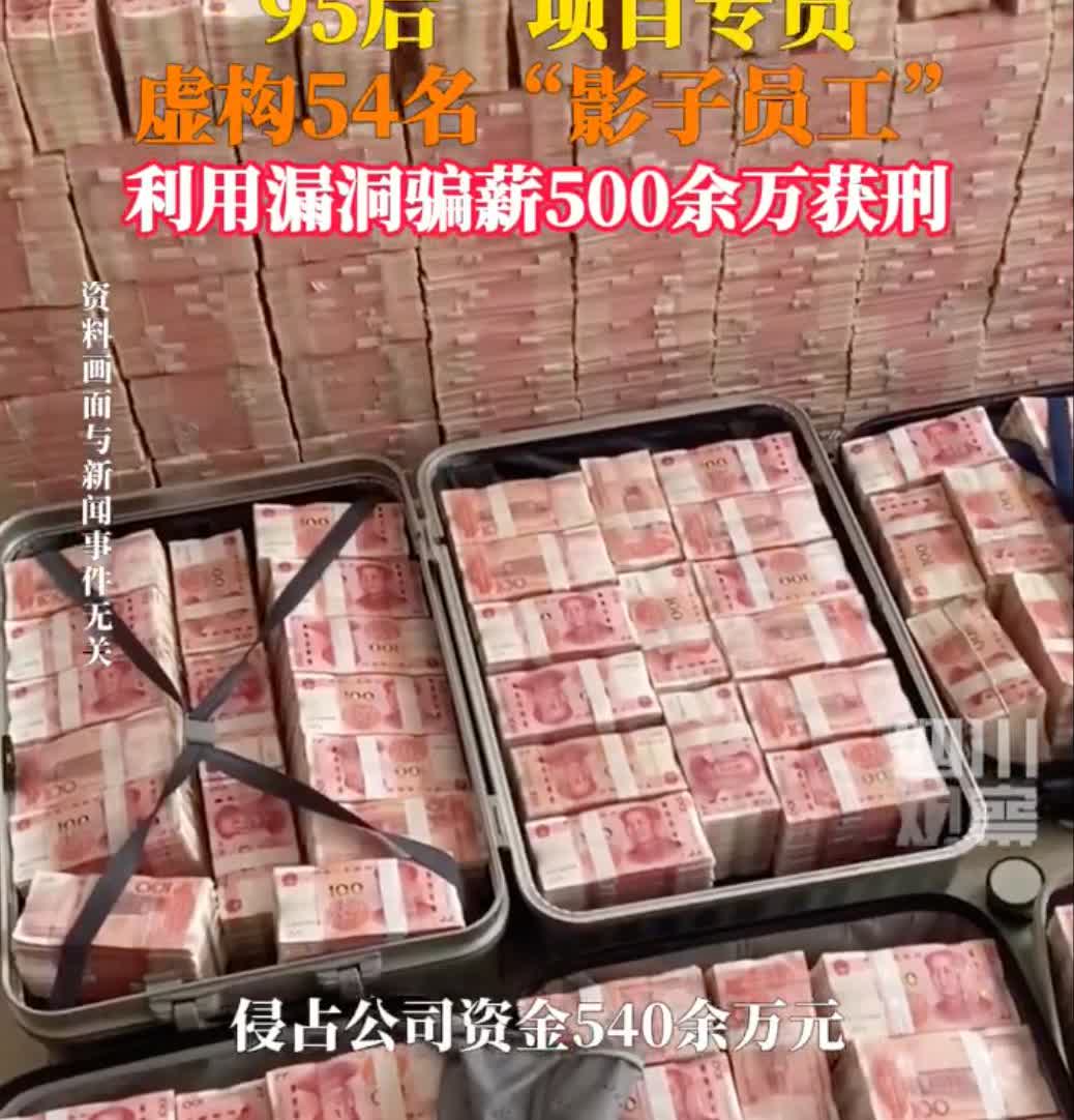 95后女子虚构员工骗薪500余万 8月23日据澎湃新闻,95后项目专员利用漏洞虚构54名“影子员工”,将钱转向亲友银行卡账户,骗薪500余万。因职务侵占罪,被法院判有期徒刑4年并处罚金10万。