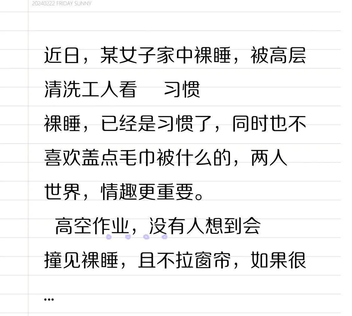 近日,某女子家中裸睡,被高层清洗工人看 习惯裸睡,已经是习惯了,