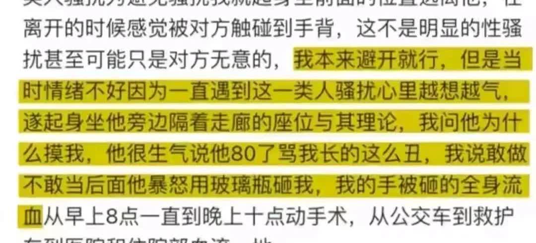 湖南长沙又有女子写作文诬告性骚扰, 女子公交车上诬陷80岁大爷, 大爷不惯着用玻璃瓶将其砸伤, 不知道女子有什么自信觉得自己漂亮, 原来女子坐在里门比较近的地方, 一位80岁大爷上车发现女子旁边有空位就坐了过去, 谁知女子称自己为了避免性骚扰离开了, 谁知走了之后走后女子又返回问老人为什么摸自己, 坐在老人旁边和老人争论说起来, 老人愤怒之至, 表示我都八十岁了, 你长得这么丑谁稀罕? 女子被激怒破防了, 两人开始对骂, 大爷也不惯着, 拿着随手带的玻璃瓶砸了女子手臂, 女子手臂流血了, 这回不用纠结被摸手臂了, 随后叔叔介入, 查看公交监控, 发现大爷根本没有摸女子手臂, 完全是女子臆想, 女子表示自己老是遇到这类人所以就误以为大爷还是这种人, 没想到大爷居然敢动手打她, 随后女子还是在网上发布了这一事件。 大家对于大爷被诬陷性骚扰后反击女子怎么看?