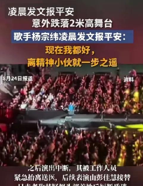 其实高台周围能不能放个气垫啊?预防摔下来挡一下也好,你看杨宗纬多吓人!23号晚上在西宁的演唱会,他正唱《越过山丘》呢,就因为舞台机械往后退,没留神从2米高的台上踩空摔下去了,目击者说好像还头着地、短暂昏迷了,当场就被救护车拉走,后面只能让彭佳慧接着唱。 还好24号凌晨他自己发文报平安了,不然歌迷得揪着心睡不着!主办方之前也发了通报,说现场医护立马急救,还送了重点医院检查,工作人员全程陪着。 杨宗纬可是唱《洋葱》《其实都没有》的实力派,好多网友都在盼他赶紧好,还有人说居然有人不认识他,希望他康复后多出来晃晃。不管咋说,平安最要紧,也希望以后演出方多注意这些安全细节,别再让这种意外发生了!#杨宗纬#