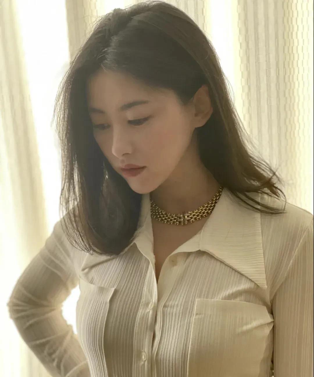 朱珠穿米色衬衫,配大金链,微敞领口藏不住凹凸感,眼神带劲、姿态慵懒,这性感直接把人“拿捏” ,谁看了不说绝!