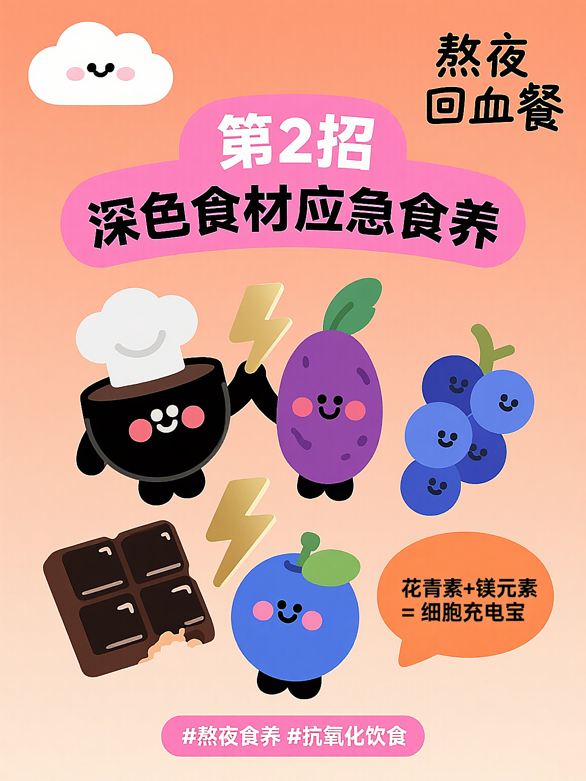 2. “深色食材”应急食养 早餐加一勺黑芝麻糊/半根紫薯,下午茶吃5颗蓝莓或一小块黑巧克力。👉 :深色食物富含花青素、镁元素,能对抗氧化应激,促进线粒体能量生成(简单说:帮细胞“充电”)。