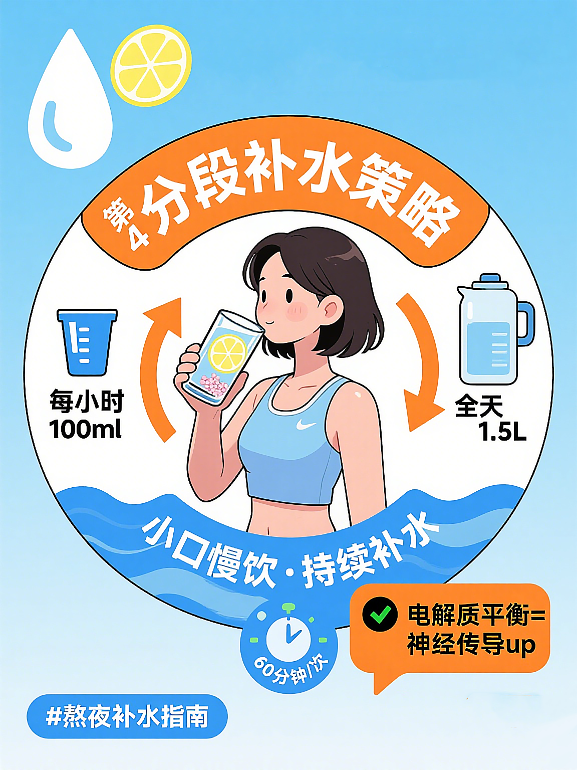 5. “分段补水”策略 每小时喝100ml温水(加少许盐或柠檬片),全天不少于1.5L。👉 :熬夜导致细胞脱水、电解质紊乱,小口持续补水更易吸收,维持神经传导效率。