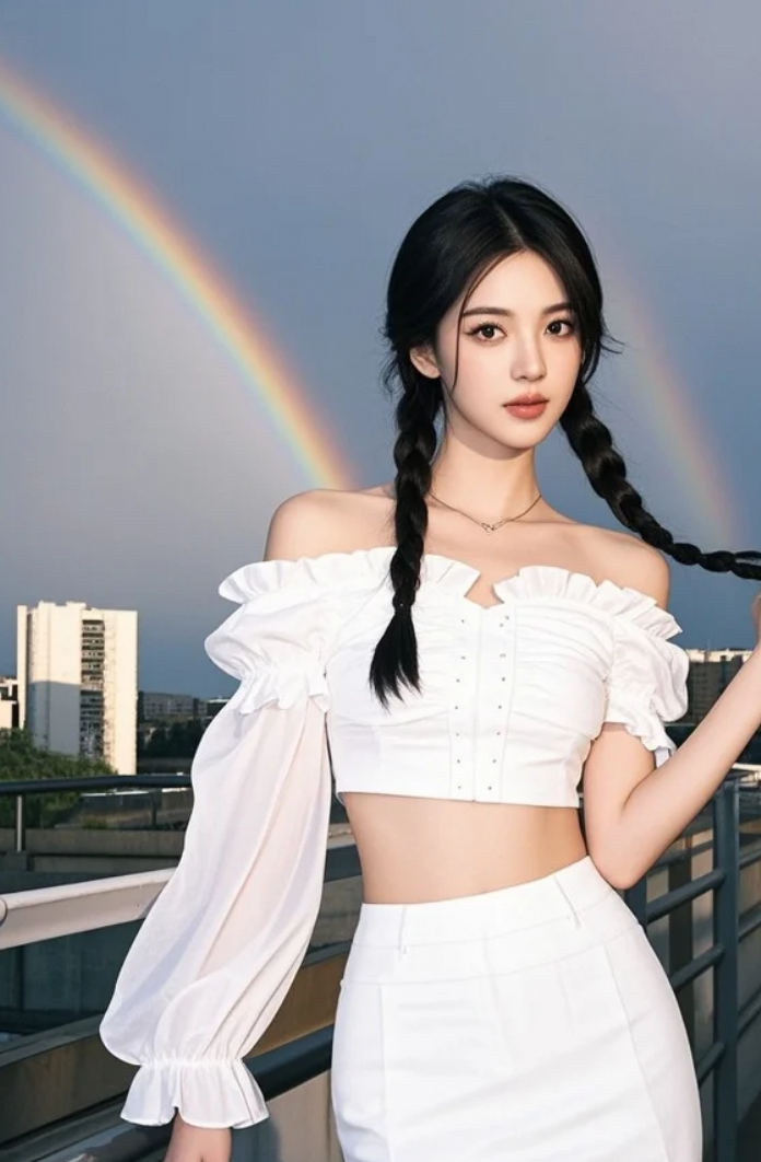 虹桥横跨,她缓步其上,走向雨后新生的梦境。