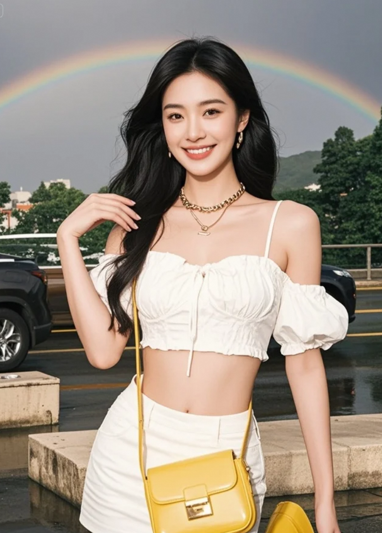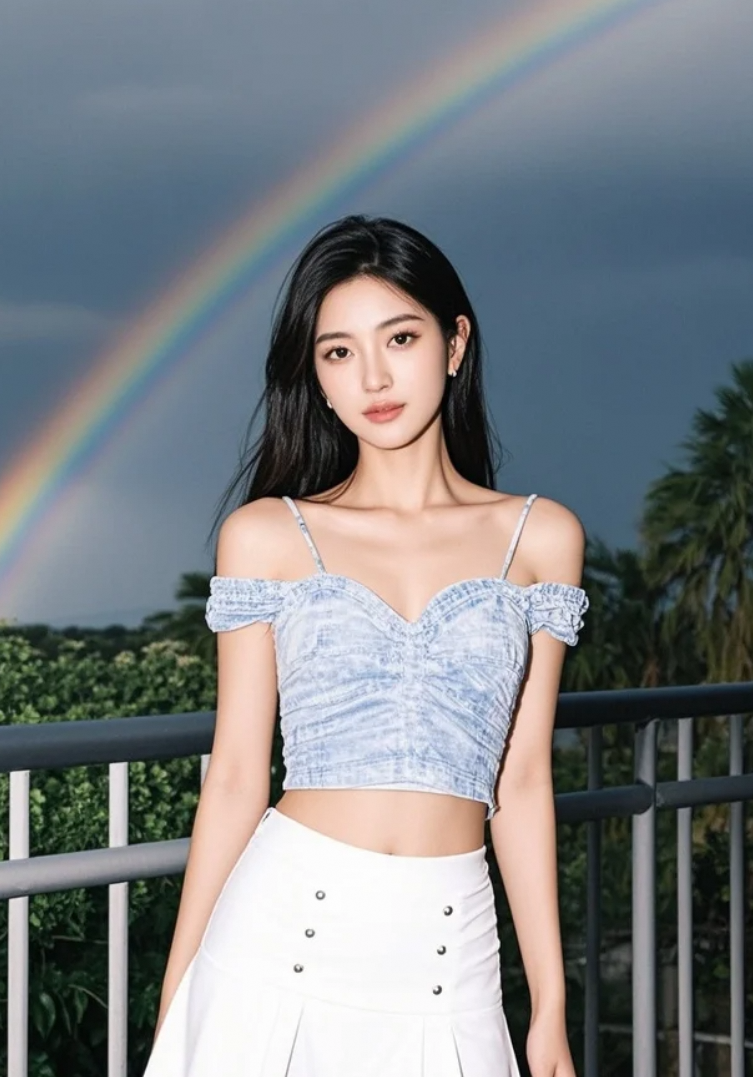 水珠在发梢跳跃,彩虹在身后铺展,她是自然的精灵。