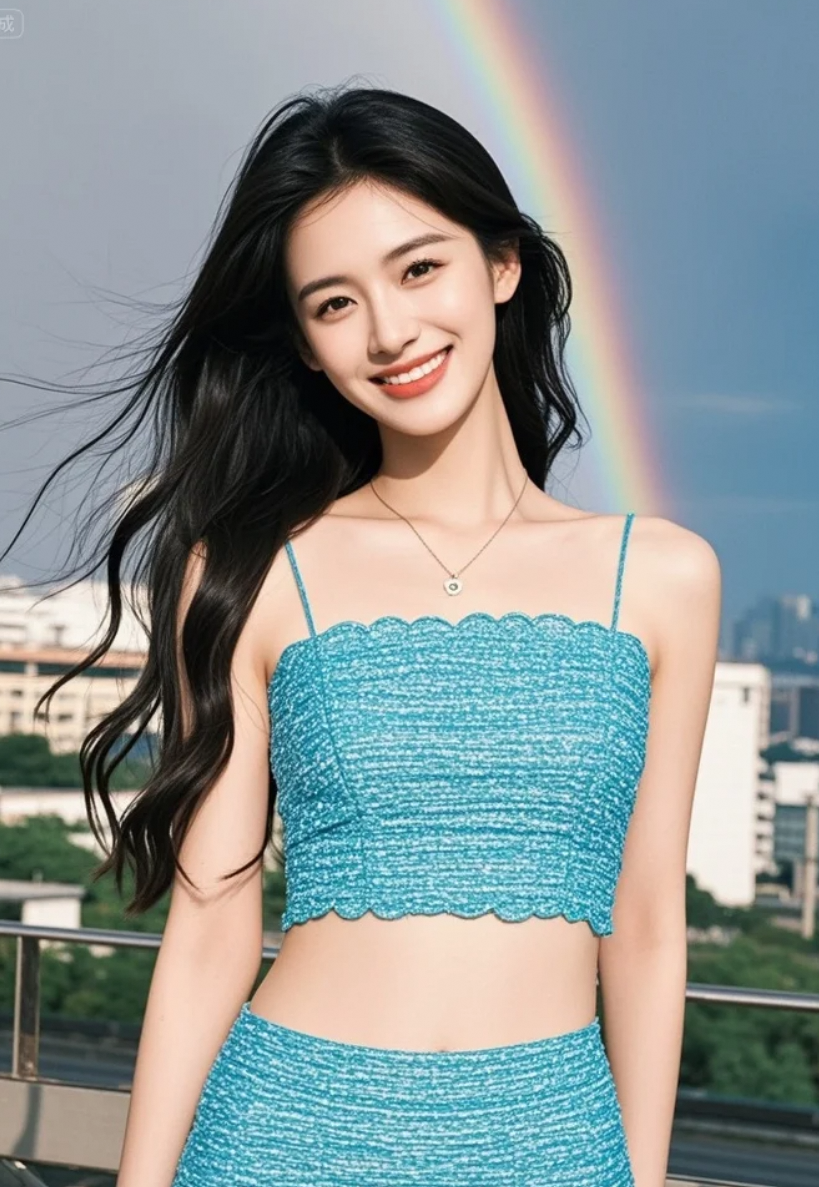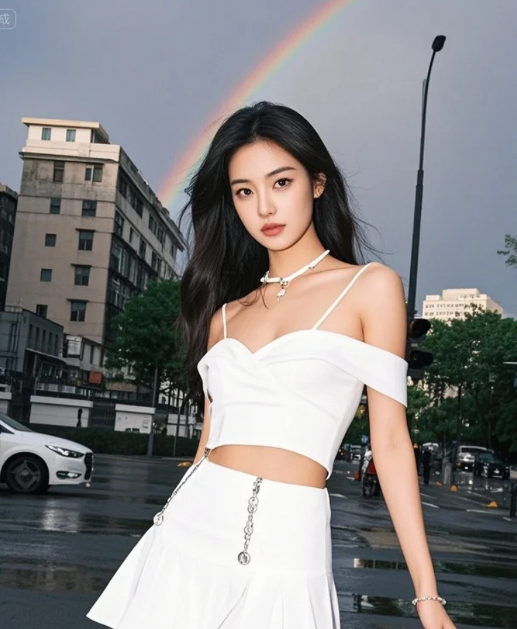 虹贯长空,她静立如画,时间在此刻凝固。