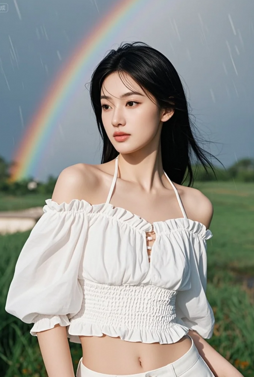 虹桥横跨,她缓步其上,走向雨后新生的梦境。