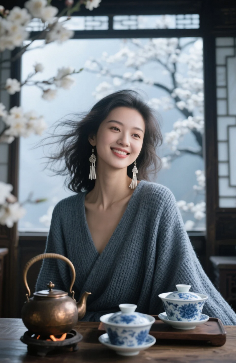 灰蓝衣袖轻挽,执壶的手势,像写一行工整的诗