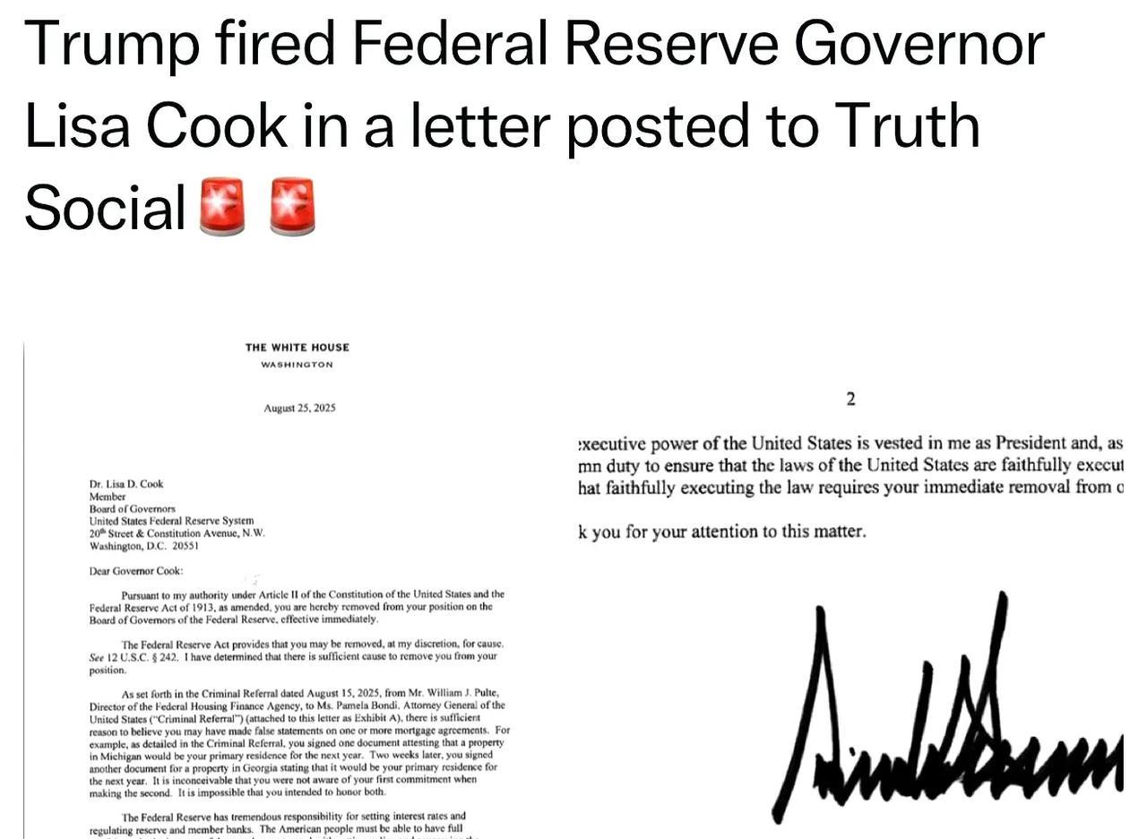 Trump在社媒发帖,将美联储有投票权的一名高管解职,理由是“房贷诈骗” 此人是Biden任总统时任命的具有投票权的美联储理事。黑人、女性,拒绝辞职。 根据《联邦储备法》,总统无权直接解雇美联储主席,除非存在“法定理由”(如犯罪行为或严重失职),且需国会批准。因此尽管特朗普对鲍威尔牢骚满腹,还是没有动鲍威尔的美联储主席职位。 对于美联储高管,法律是这样规定的,总统可因“正当理由”解雇普通理事。 2025年8月26日,特朗普以“抵押贷款欺诈”为由解雇拜登任命的理事丽莎·库克(Lisa Cook),创历史首例。