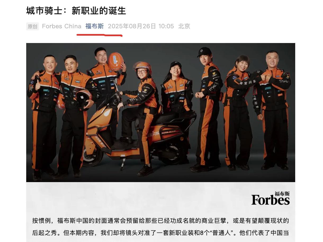外卖骑士首次登上《福布斯》杂志封面,看似意外,实则必然! 刚刚看到个消息,《福布斯》下一期《福布斯》中文杂志的封面,将会是8位淘宝闪购“城市骑士”代言人! 对于这个事儿挺多人感觉比较意外,一方面来说,代言人都是明星之类的,可这次淘宝闪购是让骑士自己为自己代言。 另外一方面来说,能登上《福布斯》杂志的人都不一般,但这次可是我们日常生活中都能看到的外卖骑士,这也是过去一百多年一线劳动者头一次成为《福布斯》的封面人物。 从这个杂志的含金量和以往的历史来看,这个事儿确实挺意外的。但如果大家了解到上周的时候,淘宝闪购和阿里及蚂蚁等20多个品牌,推出了“城市骑士·诚意计划”,给予了骑士们很多工作之外的生活保障,像家庭孩子上学、大病医疗等多个方面保障拉满。 再看这8位“城市骑士”代言人登上《福布斯》杂志封面,就能发现,这是外卖行业的一个重大变化,即,骑士们的服务价值被商业评价体系看重,劳动者站在了品牌和社会叙事的中心。 对于这个事儿,中国新就业形态研究中心主任张成刚也表示:以登上《福布斯》杂志封面为标志,从“骑手”升级为“城市骑士”,从工服升级为职业制服,再到骑士保障、激励和发展体系的全面升级,是现代服务业发展中具有标志性意义的事件,赋予了骑士群体新的职业内涵和社会意义。 所谓新的职业内涵和意义,简单来说,就是骑士这个职业并不是如大家之前所理解的没啥意义,反而是骑士这个职业的重要性会被凸显,一项工作者也能在骑士这个岗位上找到自己的价值。 就像这8位代言人一样,他们有的是全国劳模、巾帼标兵、外卖诗人,都在外卖骑士中找到了人生的意义。 比如“外卖诗人”王计兵就很有代表性,他写的诗《赶时间的人》,曾在2023年登上豆瓣诗歌图书排行第一名。对于,外卖骑士这个行业王计兵表示很喜欢这份工作,因为每天和不同的人打交道,说不同的话,就是在观察不同的人生。 回过头来看,能发现8位骑士登上《福布斯》杂志封面,能代表的是骑士这个职业在社会人们日常生活中已经成为必不可少的一环,将其放在和商业精英同等的位置来评价,是很有必要性的。