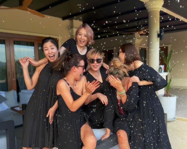 佘诗曼晒与好姐妹旅游时的合照,七魔女一起穿黑色服装亮相,皮肤好像晒黑了不少