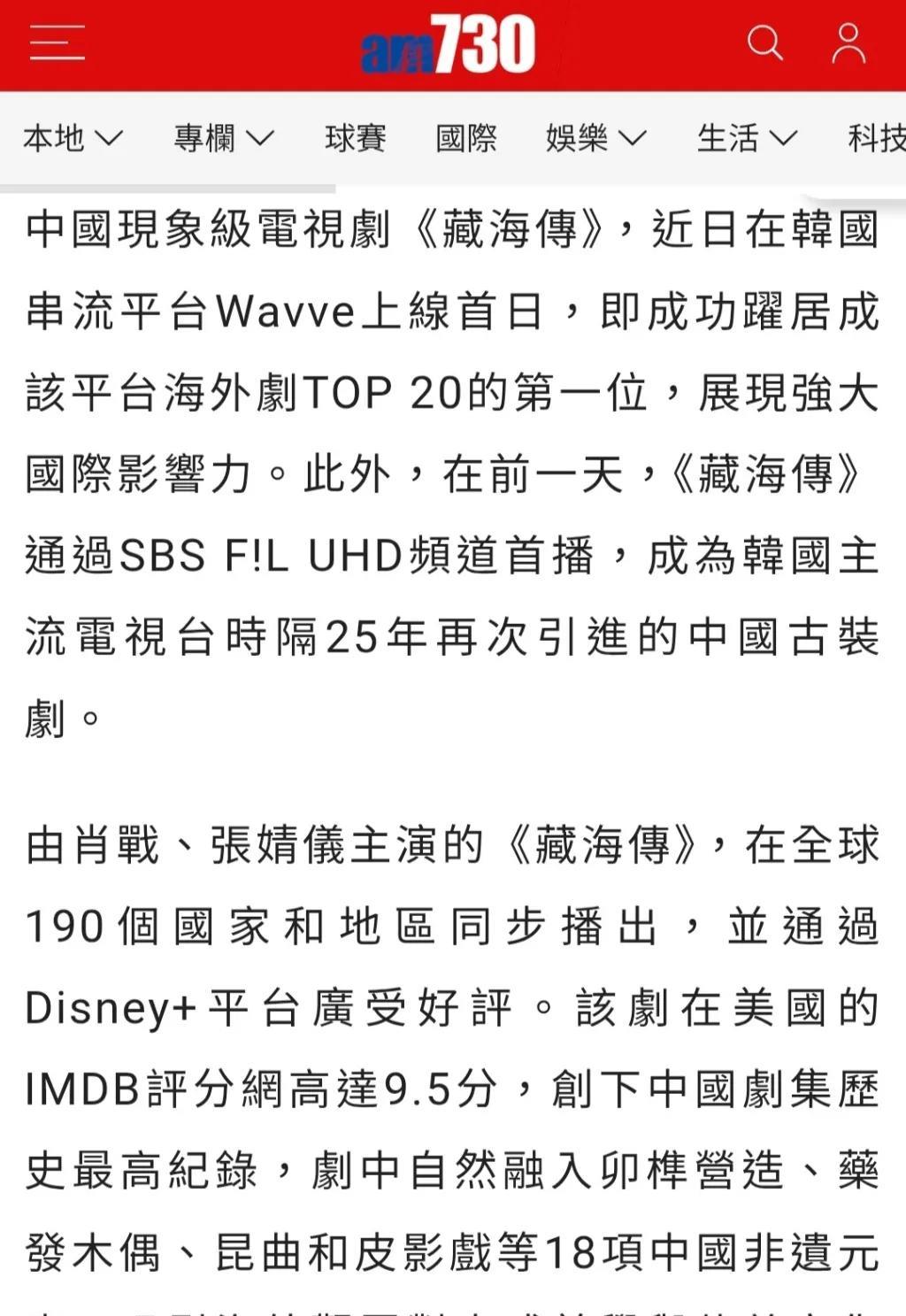 8月21日,香港报纸AM730报道:中国现象级电视剧《藏海传》在韩国串流平台Wa