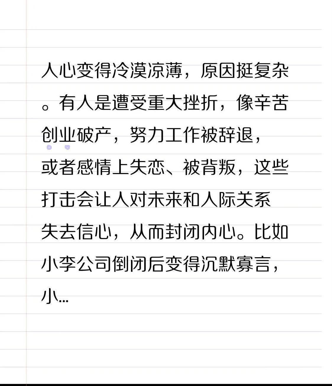 人心变得冷漠凉薄,原因挺复杂。有人是遭受重大挫折,像辛苦创业破产,努力工作被辞退,或者感情上失恋、被背叛,这些打击会让人对未来和人际关系失去信心,从而封闭内心。比如小李公司倒闭后变得沉默寡言,小王失恋后疏远他人。也有人是受成长环境影响,原生家庭孩子多,父母无暇照顾,缺关爱;成年后家庭又不和谐。长期压抑失意的生活,会让人变得敏感、封闭,不愿相信他人,自然就冷漠凉薄起来。