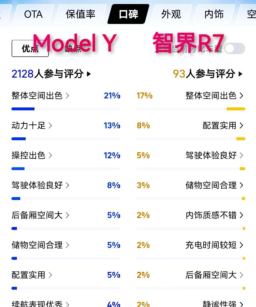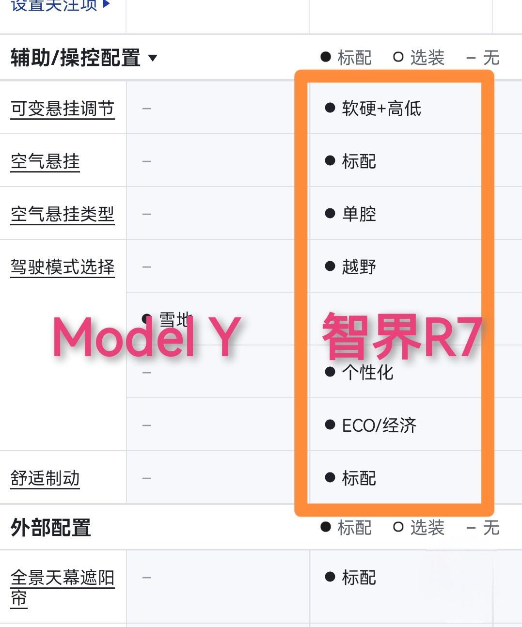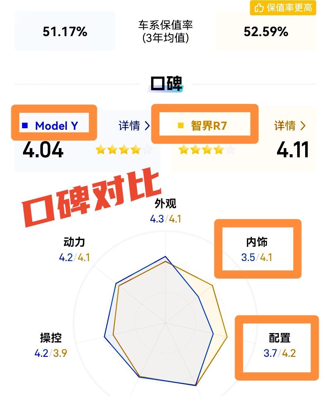 选车第一眼肯定看外观,都挺有识别度,但是整体上R7多少有点借鉴Y的设计,R7也要大一点,无论内外。 特斯拉Model Y走的是“极简风”,这是个稳定选手,高销量也说明了它经过市场考验和筛选的,个人觉得识别度高,耐看,实用。智界R7则是“简约中带豪华”,识别度也很高,车身线条流畅,还带个小尾翼。总的来说,比Model Y更精致,更有质感。外观这种东西就是看着舒服就行。 不过R7这次车标升级还是非常重要的,30W的市场没个看起来值钱的标还是不行的,起码现在这个标一看就知道是跟问界同个档次的。原来的字母标多少有点杂牌的感觉。 不可思议R7带空气悬架,带cdc,带激光雷达,华为加持,而且同样是前双叉臂,后5连杆,R7的操控性动力和驾驶感受居然都落了下风。特斯拉调教真的有那么牛吗?不得不说特斯拉Model Y有点东西,比R7更少的配置,但是驾控评分居然超过R7,“加速猛”,方向盘指向特别准,打多少转多少,高速车身跟随性很好,不会有晃悠的感觉。不过它的悬架偏硬,过减速带的时候,后排乘客能明显感觉到颠簸,要是路面有小石子,胎噪会传到车里,尤其是跑高速的时候,风噪也比智界R7大。智界R7它全系标配了空气弹簧和CDC减震器,过减速带的时候,减震器能把震动过滤得很干净,后排乘客更舒服。方向盘虚位特别小,刹车线性,另外,它的转弯半径比Model Y 小,在小地方掉头,不用倒一把就能过。个人感觉舒适性要好很多。 能耗上,特斯拉貌似要控制的好一点,不过看个人开车习惯拉,基本都在15-16kWh/100km左右,差别不大,看开车习惯。 看看口碑维度,六个维度,动力,外观,操控,舒适性、空间、内饰和配置,R7久配置和内饰分数高于毛豆Y,这个还真的挺不解的。所以也只能参考拉。特斯拉Model Y的车主,最满意的是它的品牌和加速。智界R7的车主,大多是被它的配置和续航圈粉。家庭实用性上R7好一点。 要是你更在意舒适性和配置,日常主要在市区通勤,偶尔跑长途,选智界 R7,不管是家人坐车的舒适度,还是自己开车的成本,都比Model Y更合适。全面接入鸿蒙智行后,售后也会好一点的。【来自懂车帝车友圈】