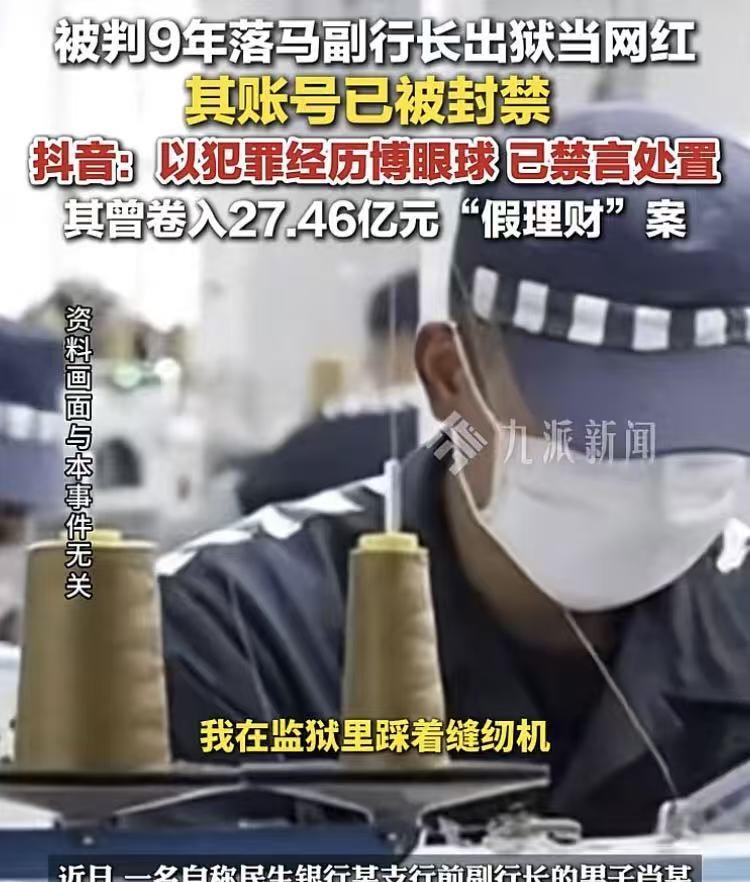 “过去的8年,我在监狱里踩着缝纫机,除了吃饭上厕所和睡觉,从来没离开过工位!” 先不说这位银行副行长27亿,罚9W判9年,里面到底有多少的“乾坤”! 一名刑满释放人员,居然还将自己的故事发到网上,而且还挺自豪的。刷到过这位副行长的两个视频,对他的口若悬河,夸夸奇谈的口才很是佩服,要不,147人共27亿怎么能随便让他忽悠出来呢? (来源:九派新闻) 劣迹艺人不能再作公众人物,这种金融诈骗就更不可以!他能对公众有什么积极影响作用?工作千千万,哪个都能活得很好,但公众人物不行。诈骗那么多钱才判9年,背后是否还有更多“精彩故事”没有暴露,坐等后续。#头号创作者激励计划#