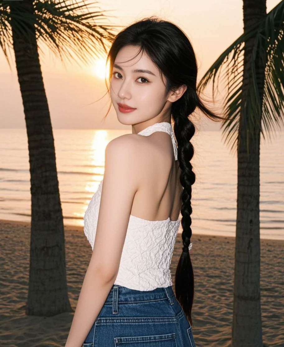 长发在金色沙滩上飞扬,她的笑容明媚动人