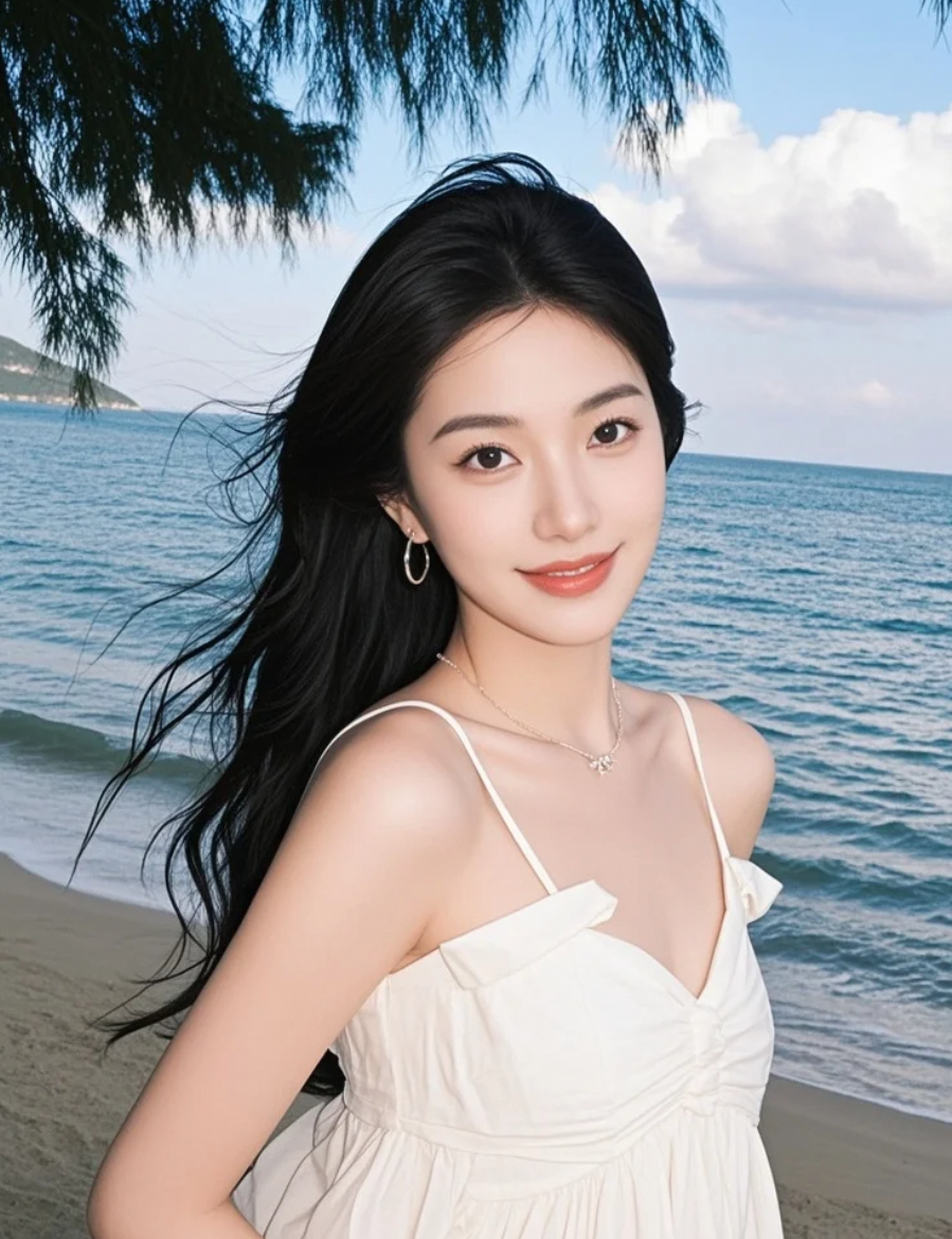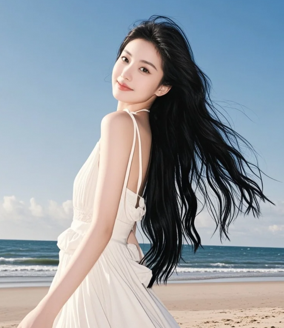 海风轻拂脸颊,沙滩长发女孩演绎清新脱俗的浪漫瞬间