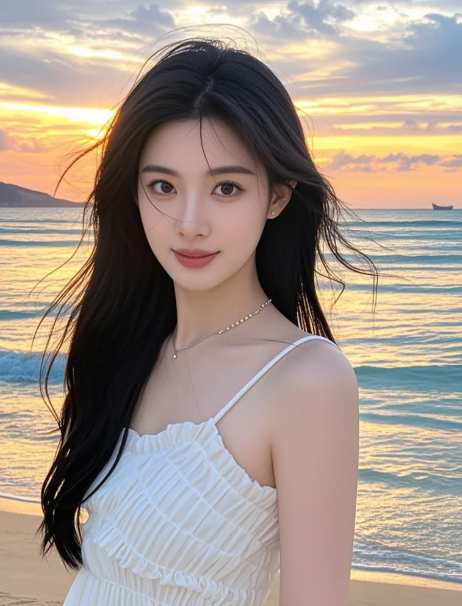 晚风轻送,沙滩上的长发女神,温柔笑意定格永恒瞬间