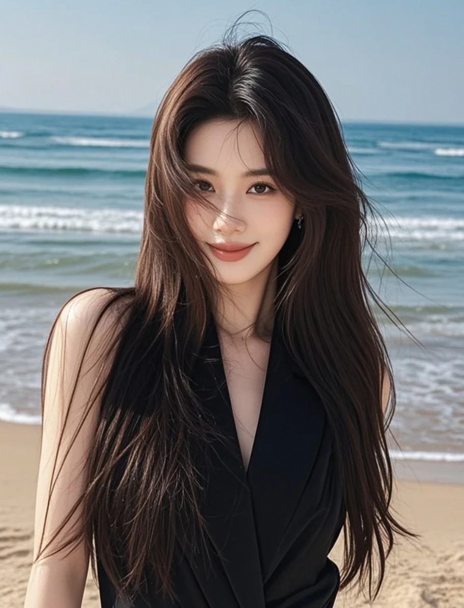 长发在海风中肆意舞动,她的宁静美动人心扉