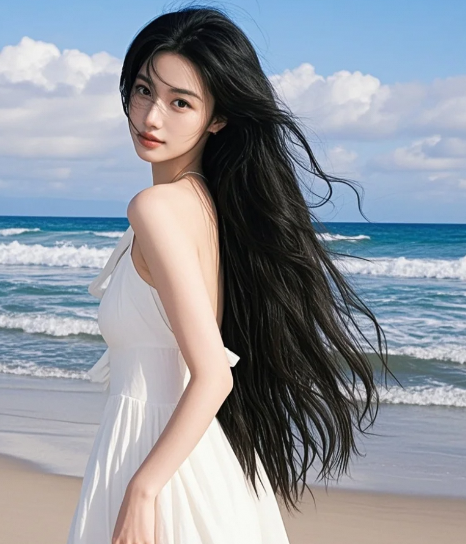 沙滩上的她,长发与海风共舞,笑容温柔如诗