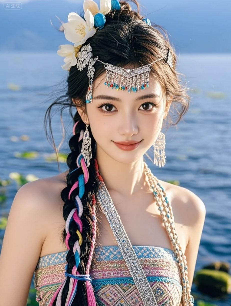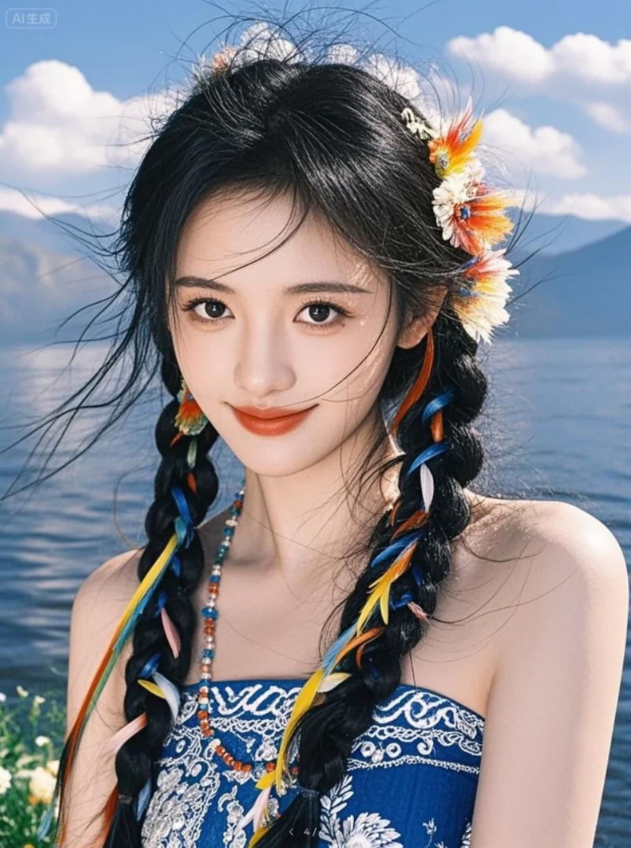 哈尼女孩在梯田镜面中跳跃,倒影与蓝天共舞