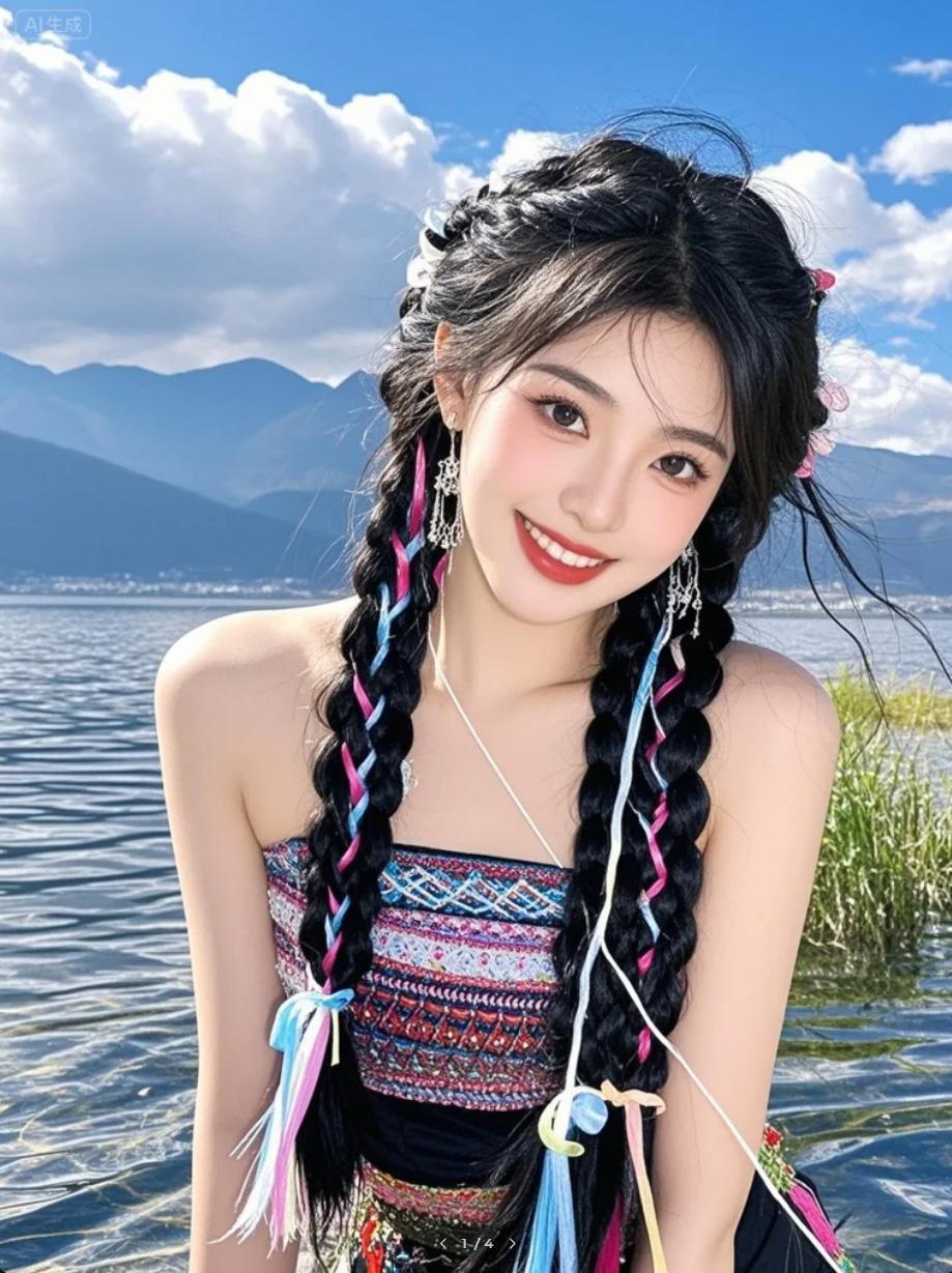 哈尼女孩蹲在湖边洗发,墨发如绸缎铺展在碧波上