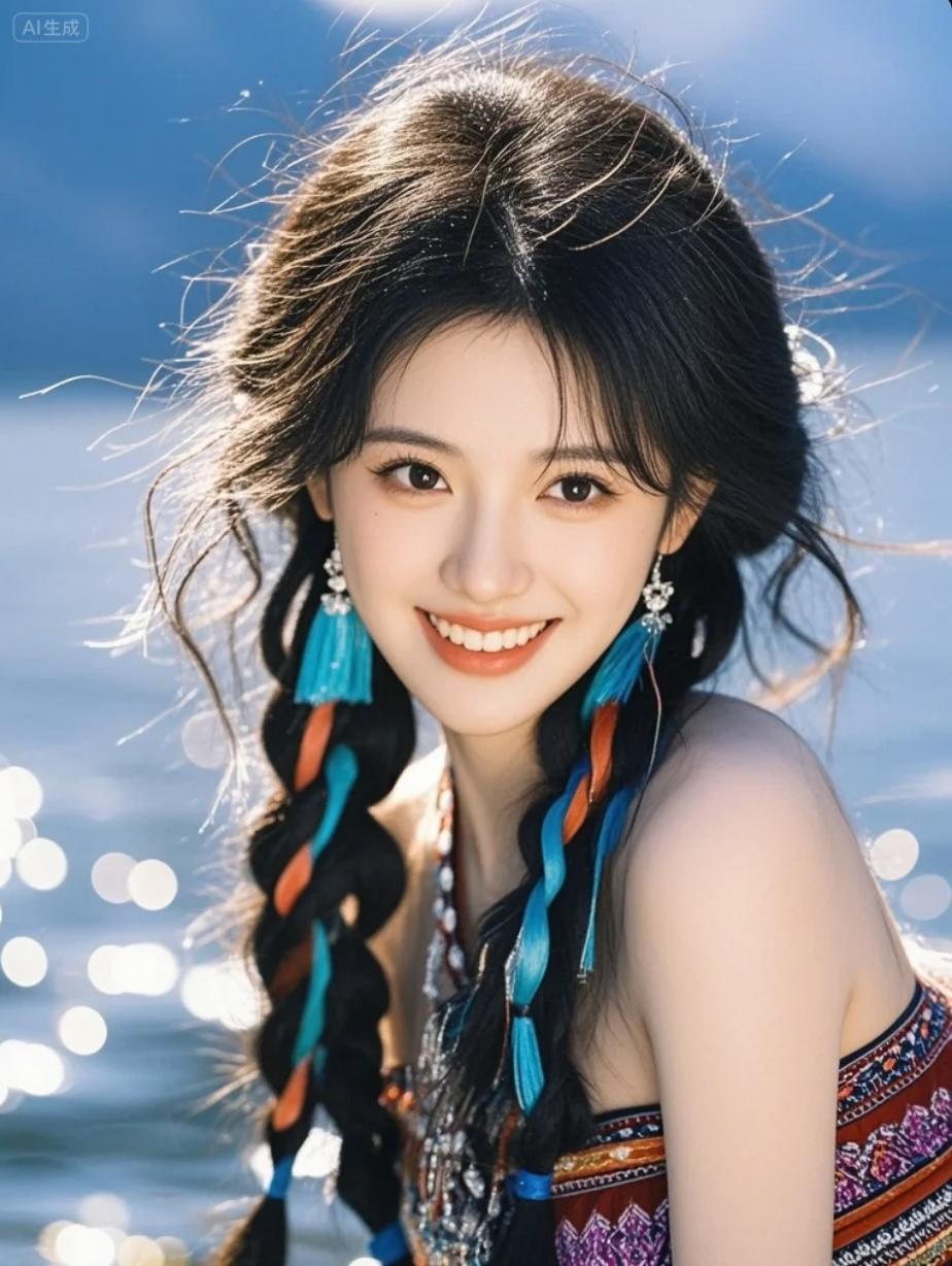拉祜族小姑娘抱着野花跑向湖心小桥:“帮我拍背影!”