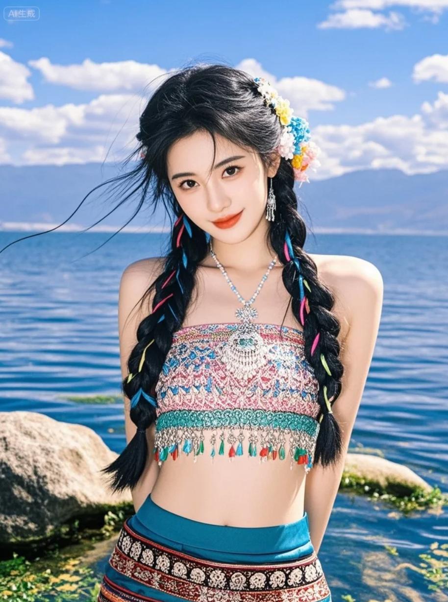 白族姐妹并肩坐在洱海石阶上,脚丫轻拍水面