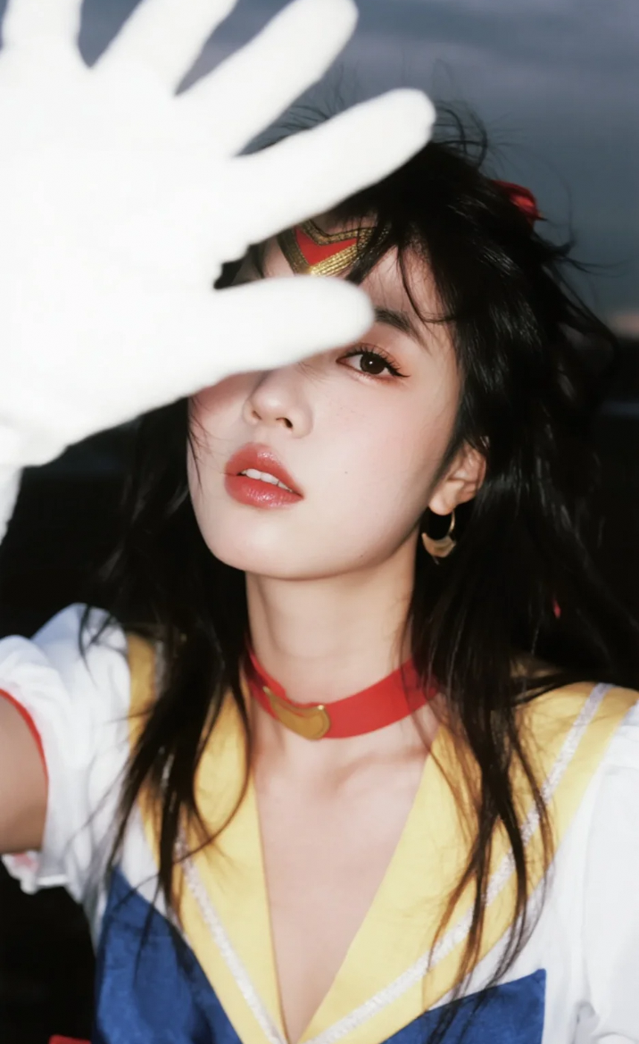 中长发如光垂落,樱桃小嘴微启,海蓝背景衬出她的高贵与秀气!