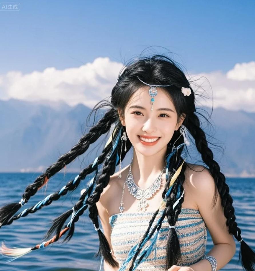 哈尼少女在梯田连湖处跳跃,倒影与天光共舞