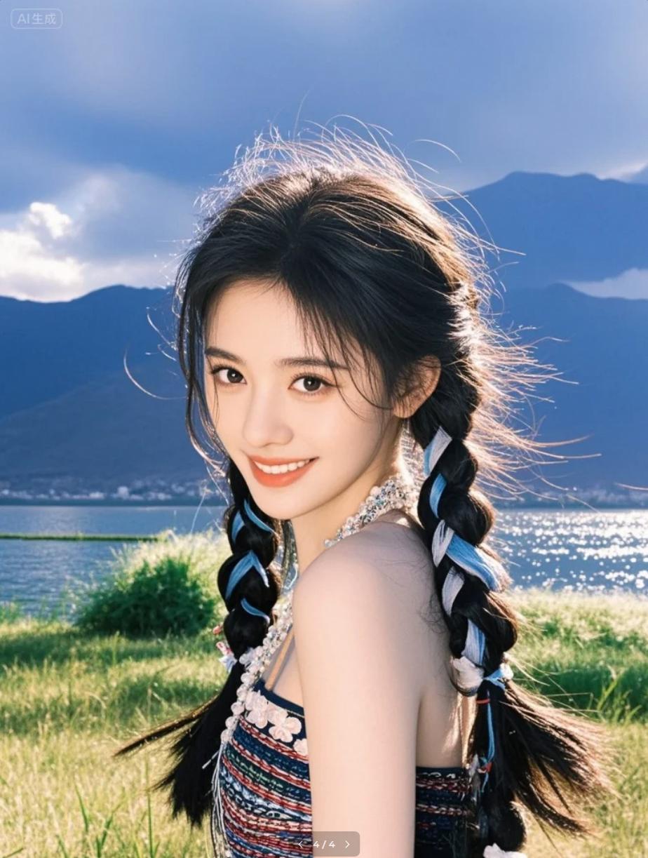 白族小女孩在湖边扎染布晾架下比心:“妈妈的手艺美吗?”