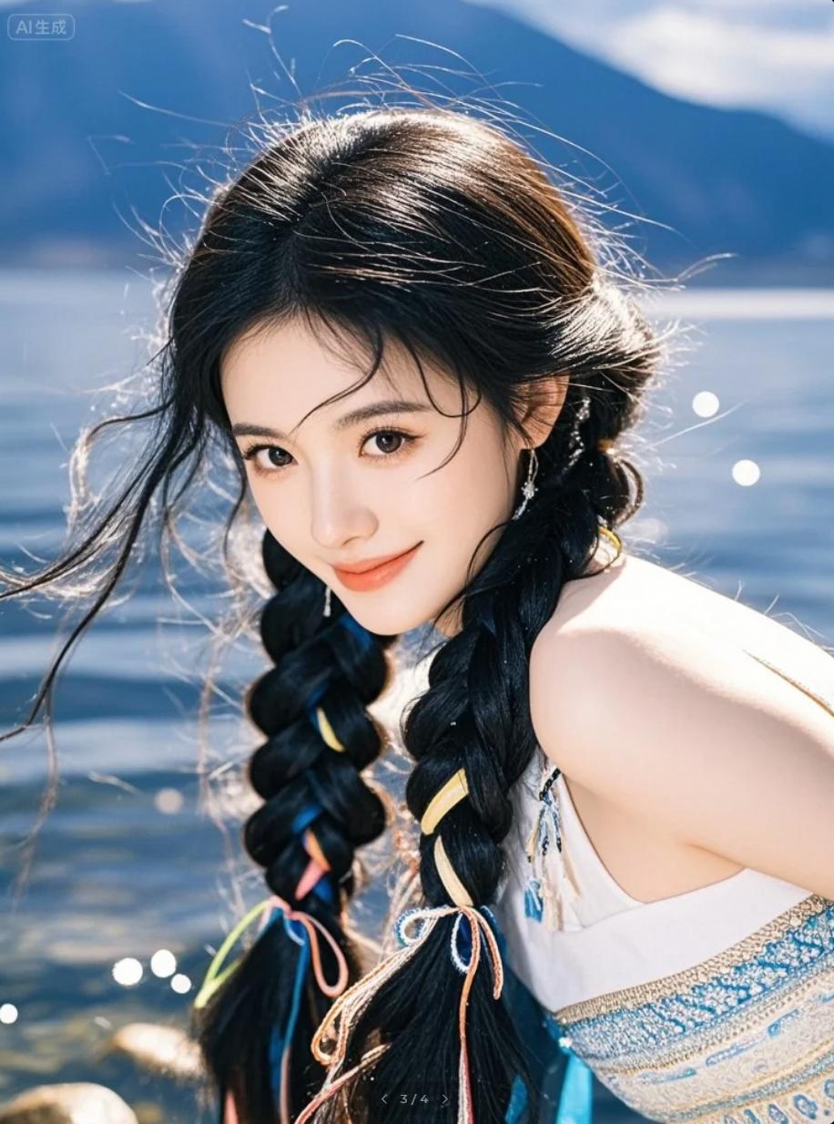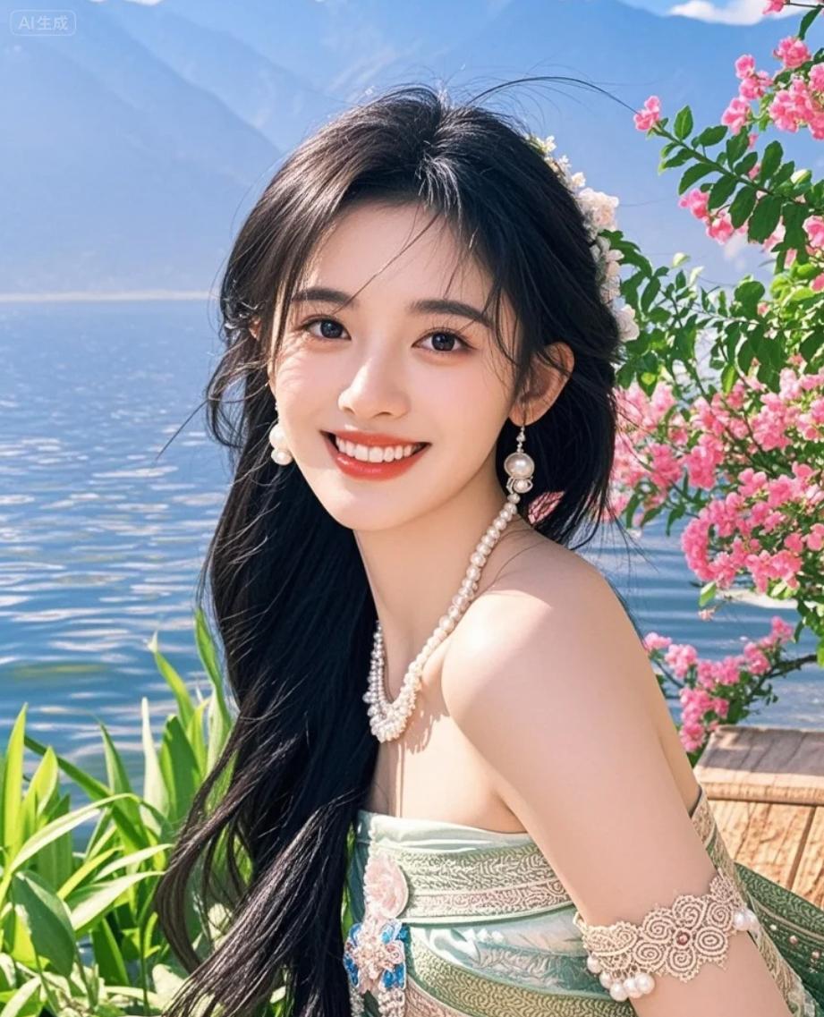 彝族姑娘在湖边山坡放羊,挥手示意:“拍我和倒影!”