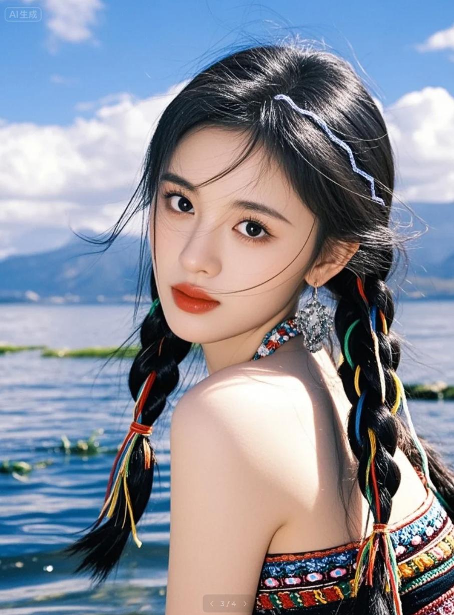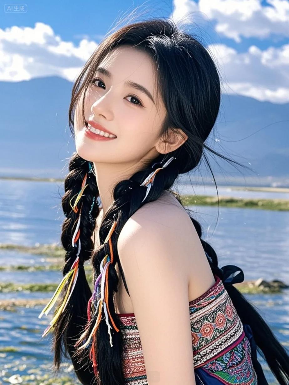 纳西族少女在湖边照影自拍:“拍我和水中的双生我!”