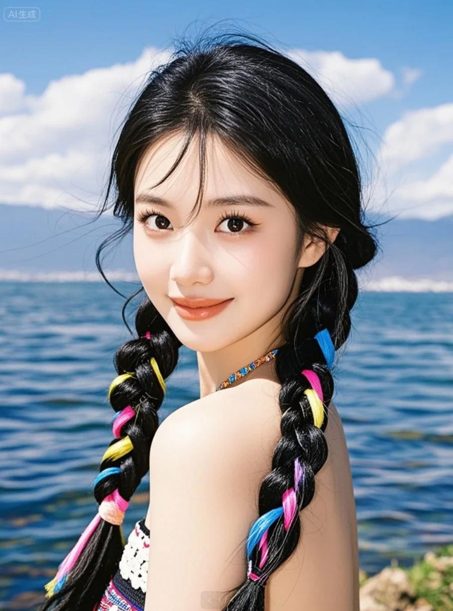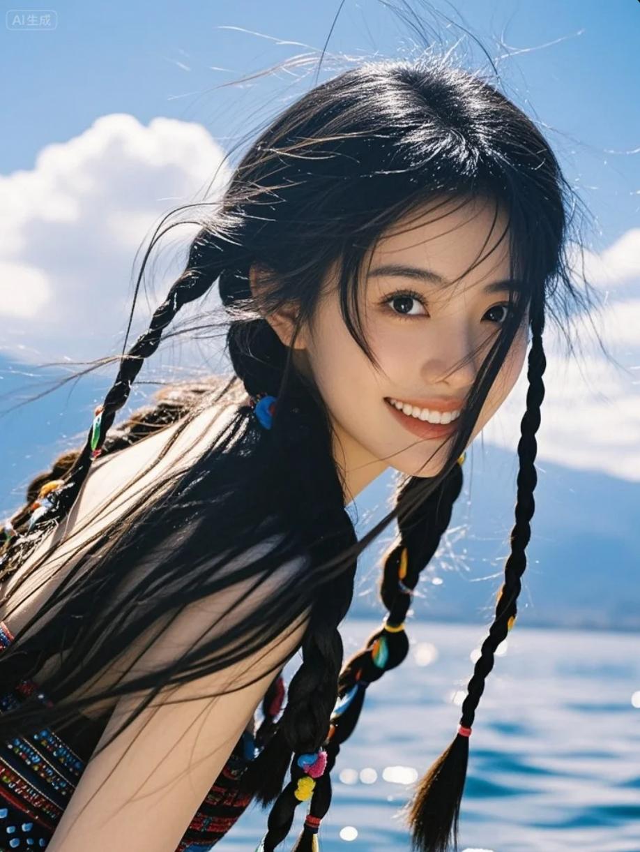 彝族姑娘在松林湖岸奔跑,回眸一笑定格在波光里