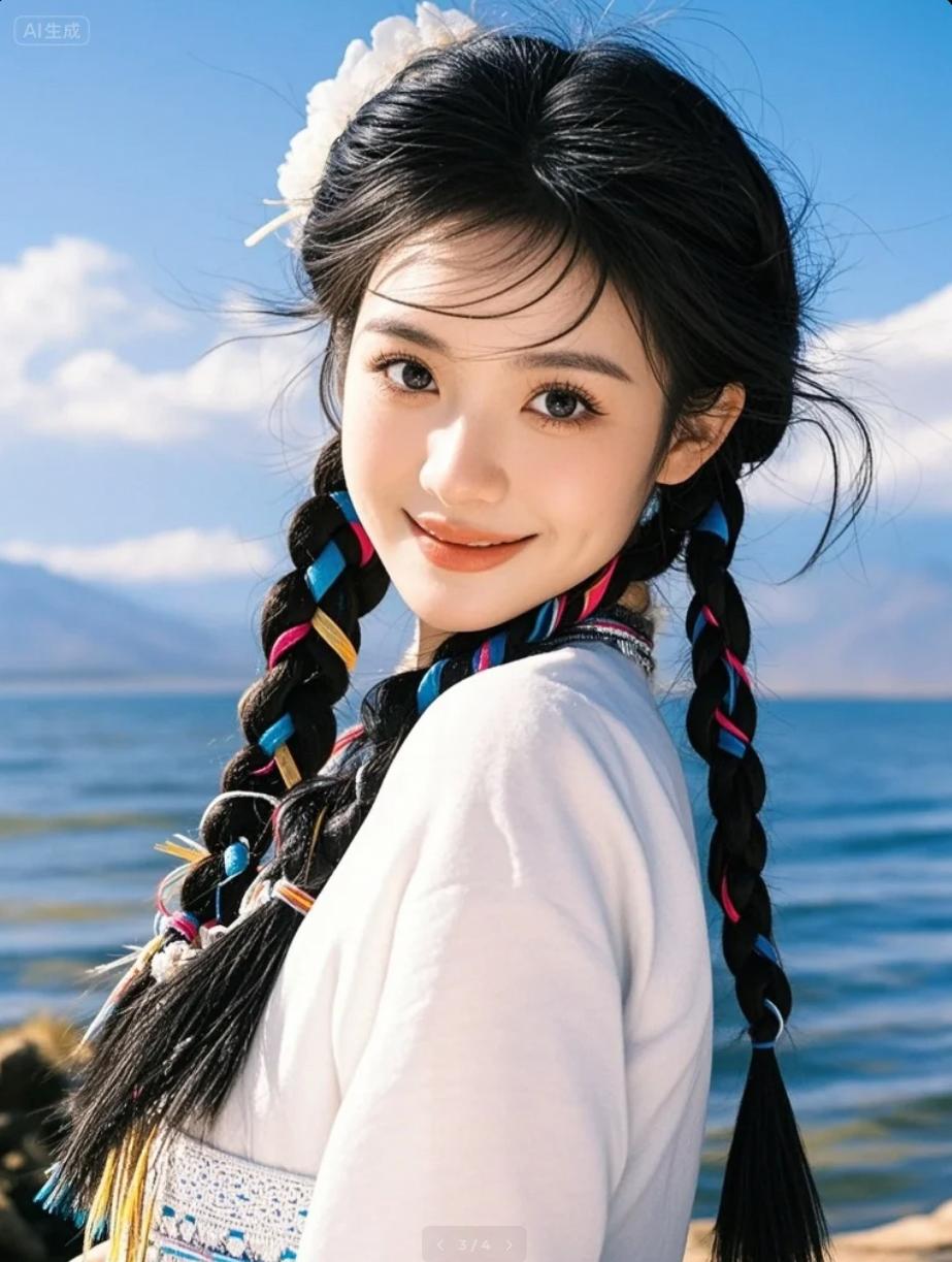 彝族姑娘在松林湖岸奔跑,回眸一笑定格在波光里