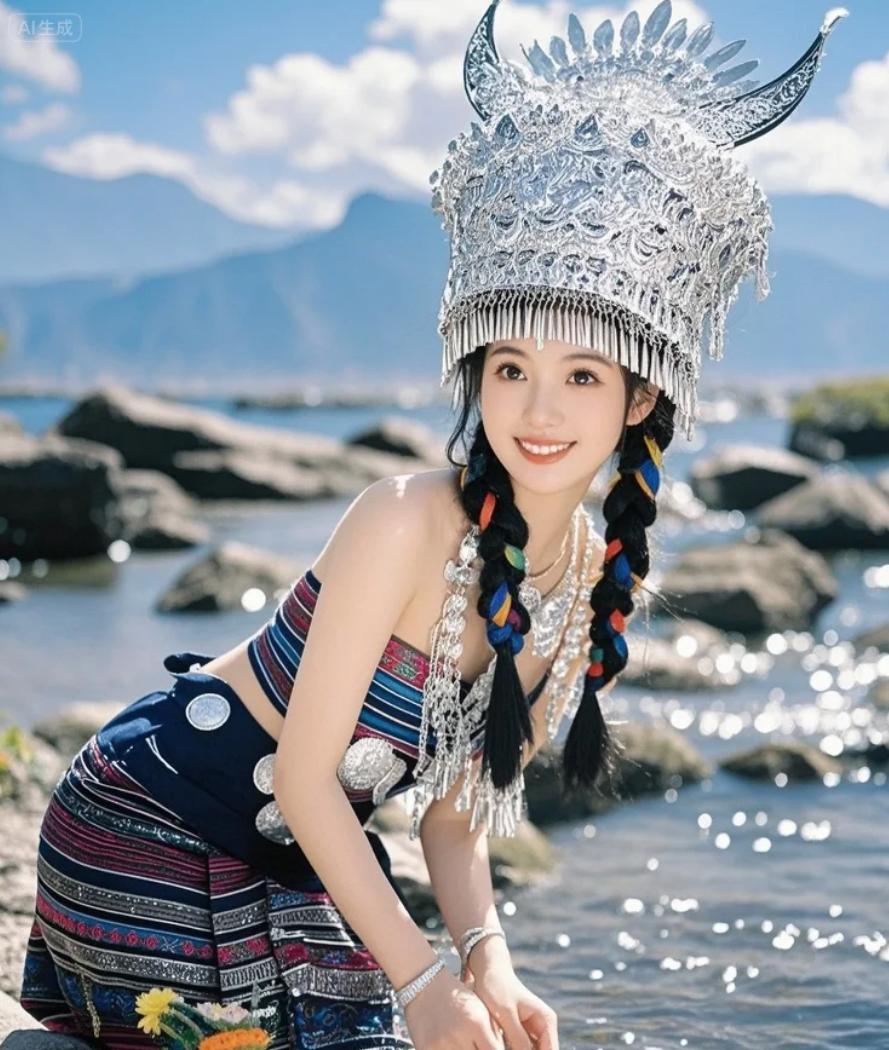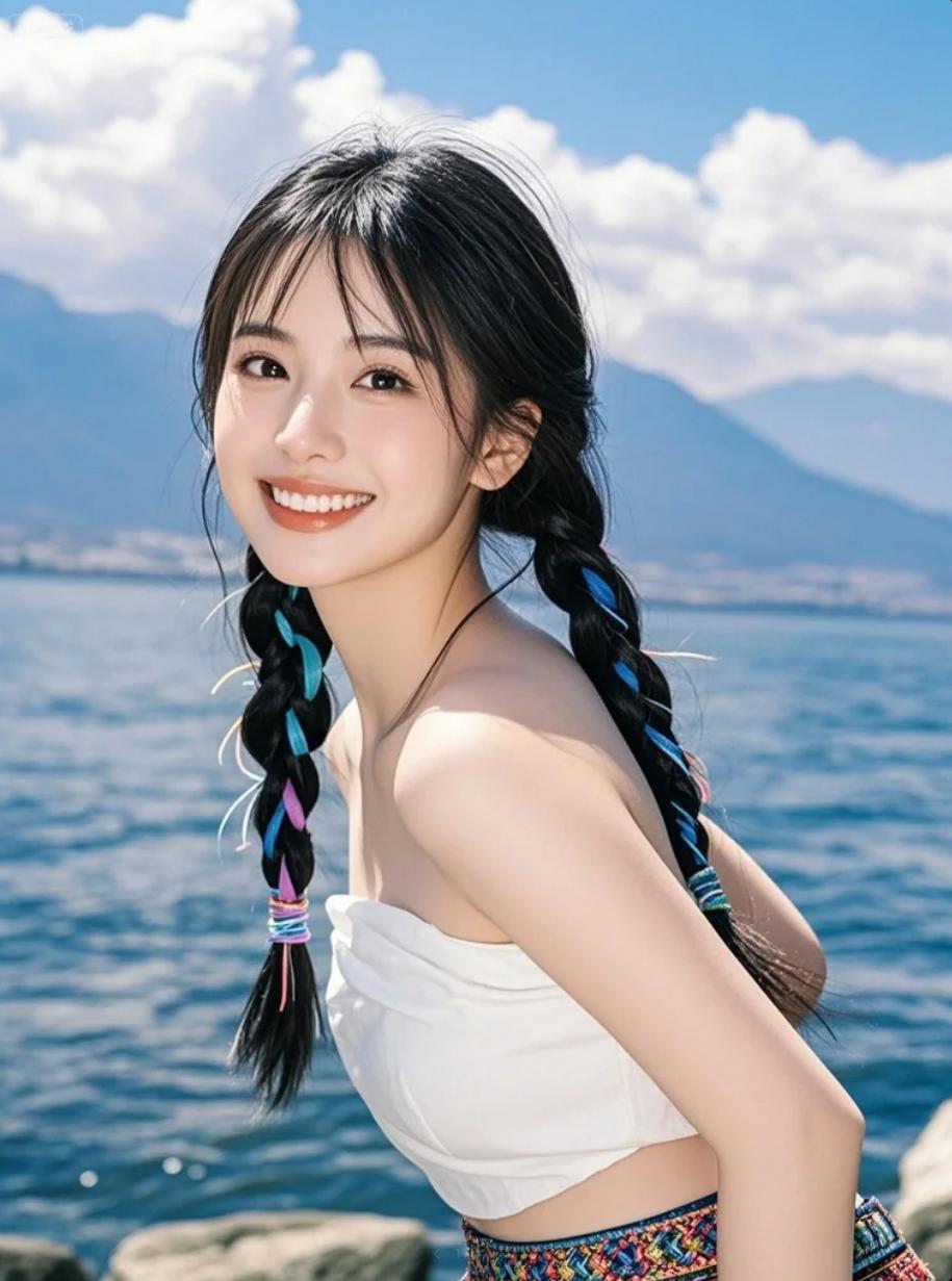 湖畔边的双麻花辫,倒影讲述着她的故事