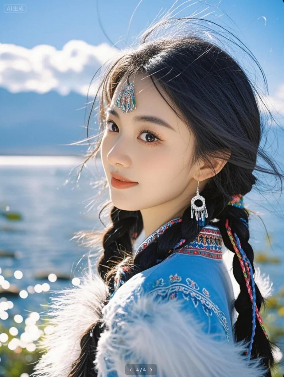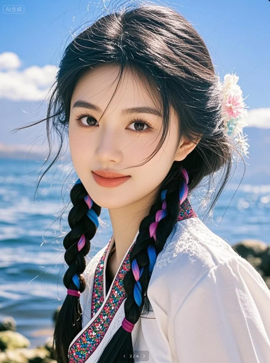 湖畔边的双麻花辫,倒影讲述着她的故事