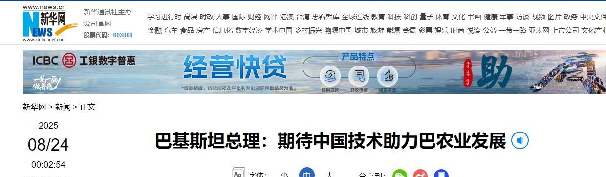 巴基斯坦总理夏巴兹22日表示:中国在农业现代化领域具有丰富经验,希望中国先进技术,能够助力巴农业实现转型升级。当天,巴基斯坦粮食安全部在首都伊斯兰堡,举行“千名农业人才赴华培训”项目,第二批300名学员欢送仪式。 这场仪式其实是中巴农业合作迈出的一大步,夏巴兹提到,他2024年去中国陕西杨凌农业示范区时,简直被那儿的现代农业技术震撼了。 巴基斯坦是个农业国家,农业不光是经济命脉,还关系到亿万人的饭碗,可问题也不少,技术落后、资源管理跟不上,再加上气候变化的压力,农业发展挺不容易。 夏巴兹看得清楚,农业现代化不只是为了多打粮食,更是让国家经济更强、老百姓日子更好的关键。 夏巴兹特别强调,对农业的投入就是对国家未来的投资,这种长远眼光,确实让人觉得巴基斯坦政府在农业上的决心不小。 中国在农业现代化上的经验,简直是巴基斯坦的宝贵财富,从智能化的农业设备到高产的作物品种,再到环保又高效的管理方式,中国的做法让农业效率蹭蹭往上涨,还能兼顾资源保护。 这些对巴基斯坦来说太重要了,毕竟人口增长、气候变暖、水资源短缺都在给农业出难题,跟中国合作,巴基斯坦不仅能学到技术,还能找到适合自己的发展路子。 夏巴兹在仪式上鼓励学员们要抓住机会,认真学,不仅要成为巴基斯坦农业现代化的主力军,还要当好中巴友谊的传播者。 中国大使也说了,这些学员会是两国合作的桥梁,为巴基斯坦农业发展出力,也让中巴关系更紧密。 这些年在中巴经济走廊的框架下,两国在农业上的合作越来越深,从建农业技术示范中心到推农业机械化、智能化,双方一直在摸索更多可能。 这些合作让巴基斯坦的农业效率提高了不少,农民的收入也有望增加,这对农村经济发展、改善民生可是实打实的好处。 现在气候变化、粮食安全问题越来越严峻,国与国之间的技术共享和经验交流就显得特别重要。 巴基斯坦的农业现代化努力,不光是为了自己的粮食安全,也是在为全球农业可持续发展做贡献,跟中国的合作展现了一种互利共赢的模式,对其他发展中国家来说也是个榜样。 信息来源:新华网 巴基斯坦总理:期待中国技术助力巴农业发展