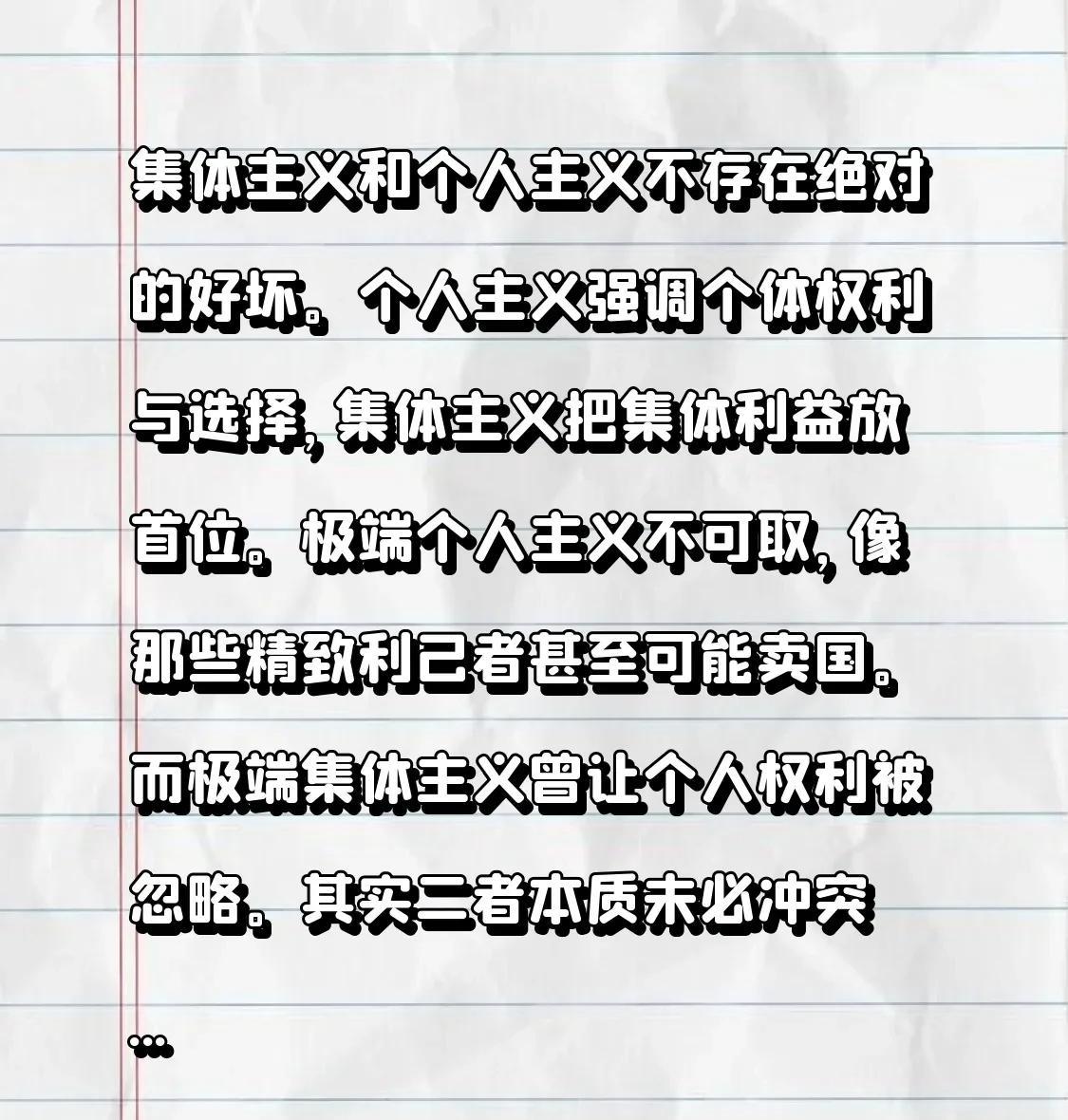 集体主义和个人主义不存在绝对的好坏。个人主义强调个体权利与选择,集体主义把集体利益放首位。极端个人主义不可取,像那些精致利己者甚至可能卖国。而极端集体主义曾让个人权利被忽略。 其实二者本质未必冲突。社会发展中,西方个人主义主导下问题频出,威胁民主秩序。我们应在不损集体利益时重视个人需求。在当代,要客观看待二者,让它们相互补充,找到平衡才是最优解。