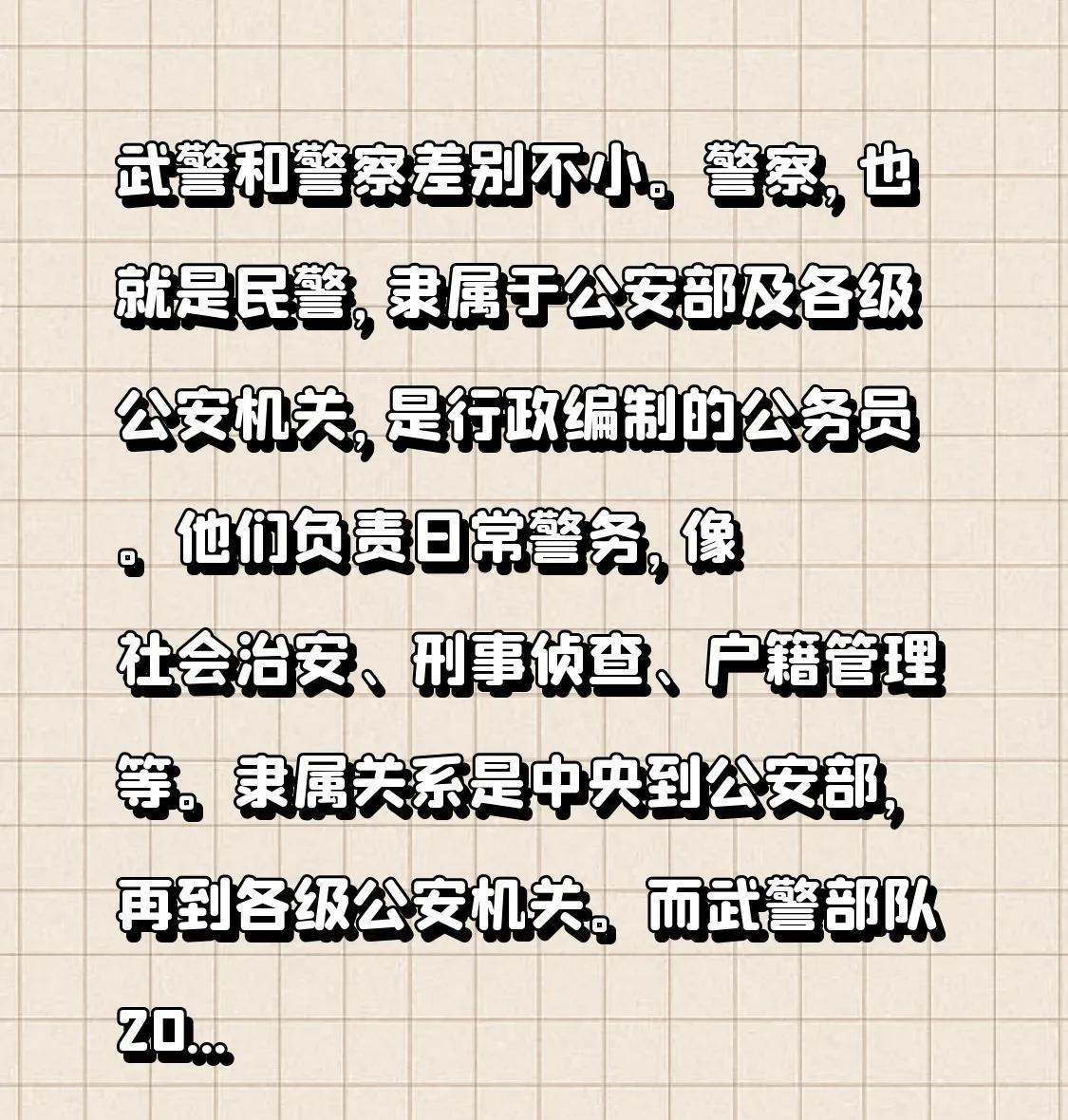 武警和警察差别不小。警察,也就是民警,隶属于公安部及各级公安机关,是行政编制的公