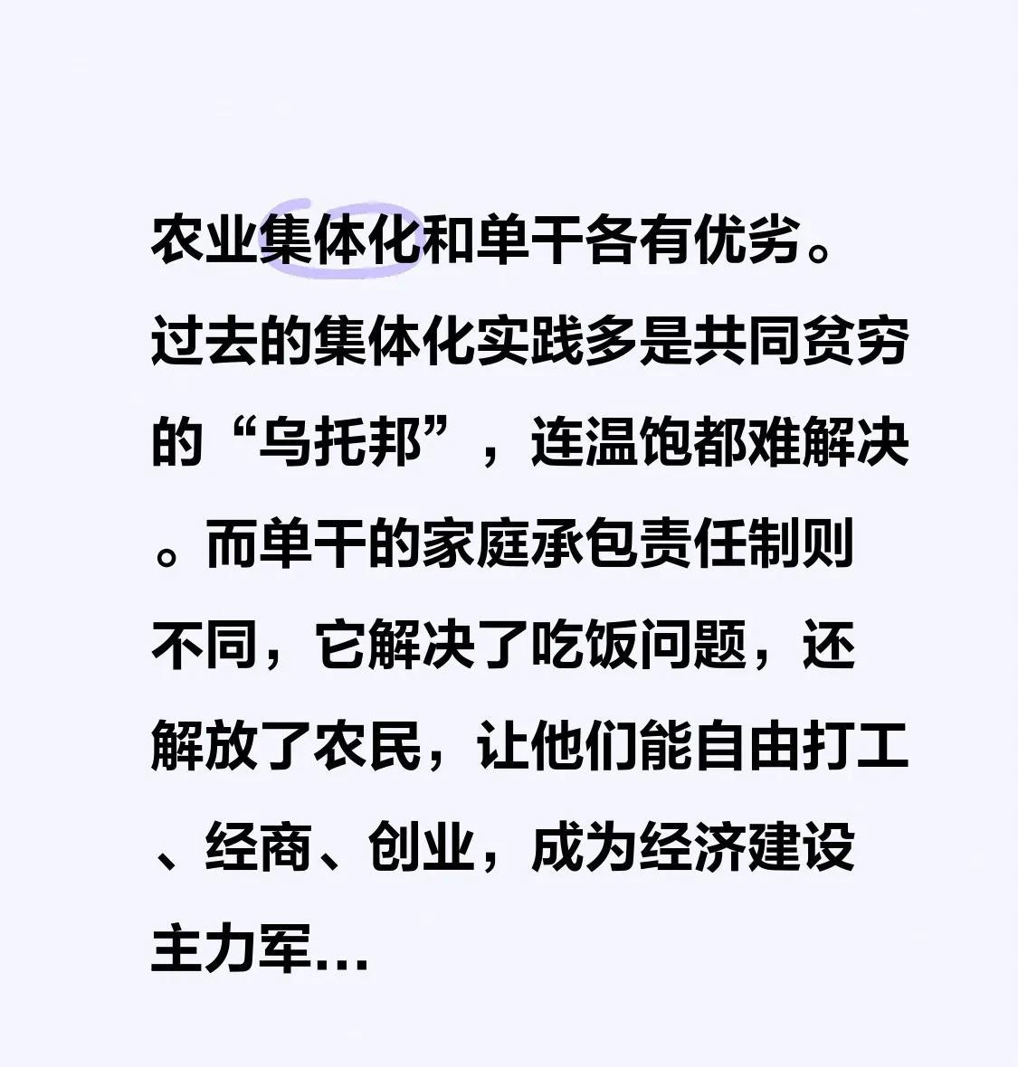 农业集体化和单干各有优劣。过去的集体化实践多是共同贫穷的“乌托邦”,连温饱都难解决。而单干的家庭承包责任制则不同,它解决了吃饭问题,还解放了农民,让他们能自由打工、经商、创业,成为经济建设主力军。 但如今,农业集体化也有优势。它能有效组合资源,让专业人员发挥所长;还是实现机械化的有力保障,单干家庭难以负担大型机械设备。所以不能简单判定谁好谁坏,得结合实际情况探索合适模式。