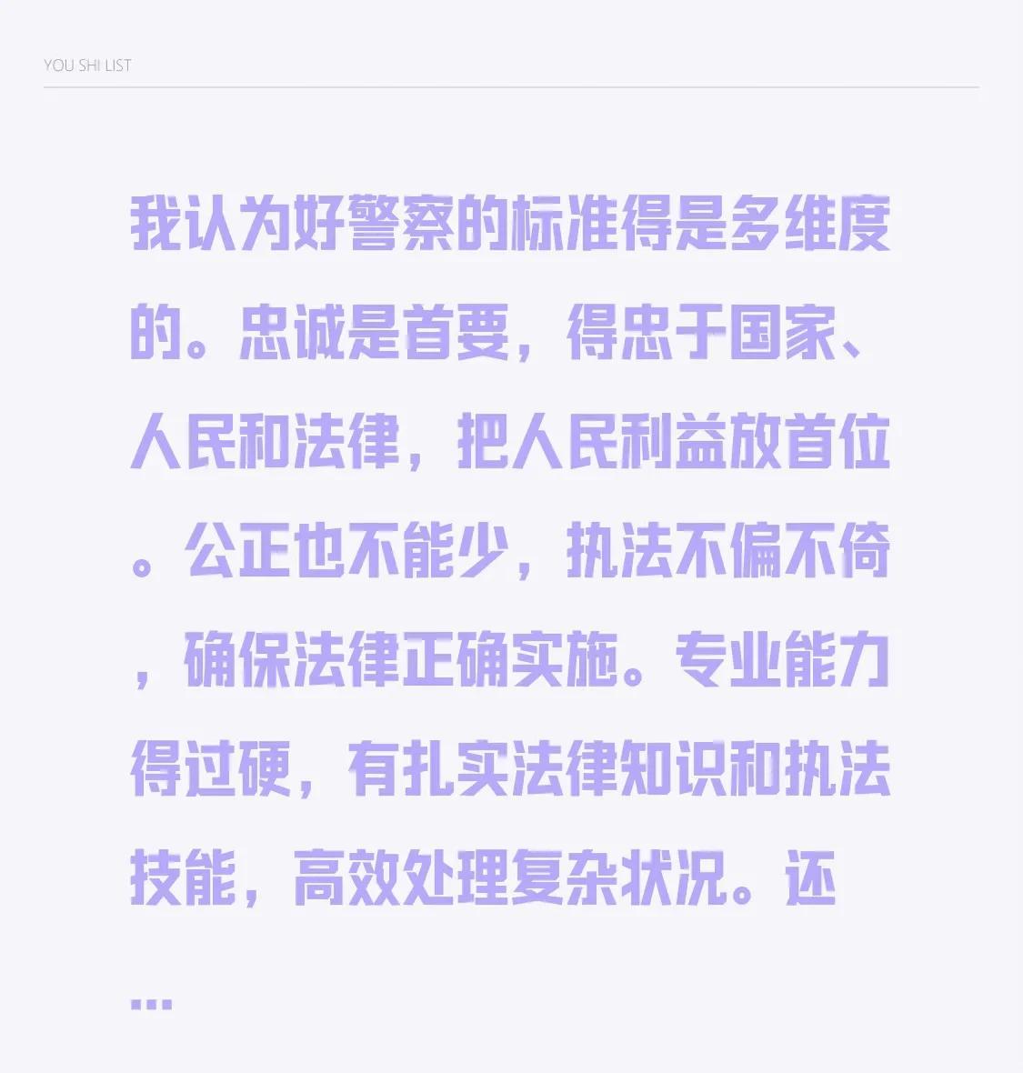 我认为好警察的标准得是多维度的。 忠诚是首要,得忠于国家、人民和法律,把人民利益
