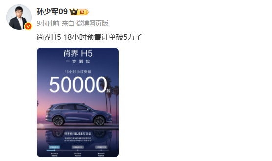 孙少军: 尚界H5 18小时预售订单破5万了 !